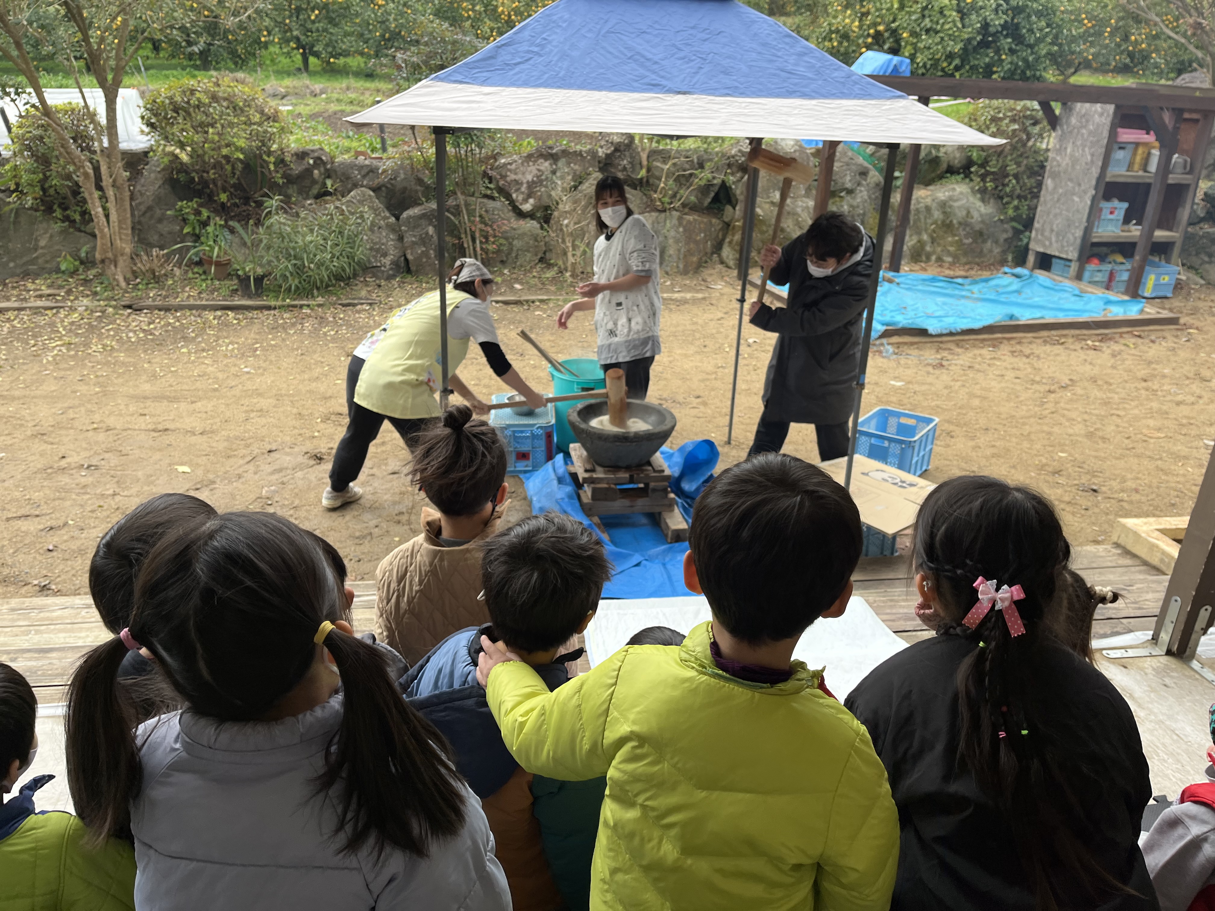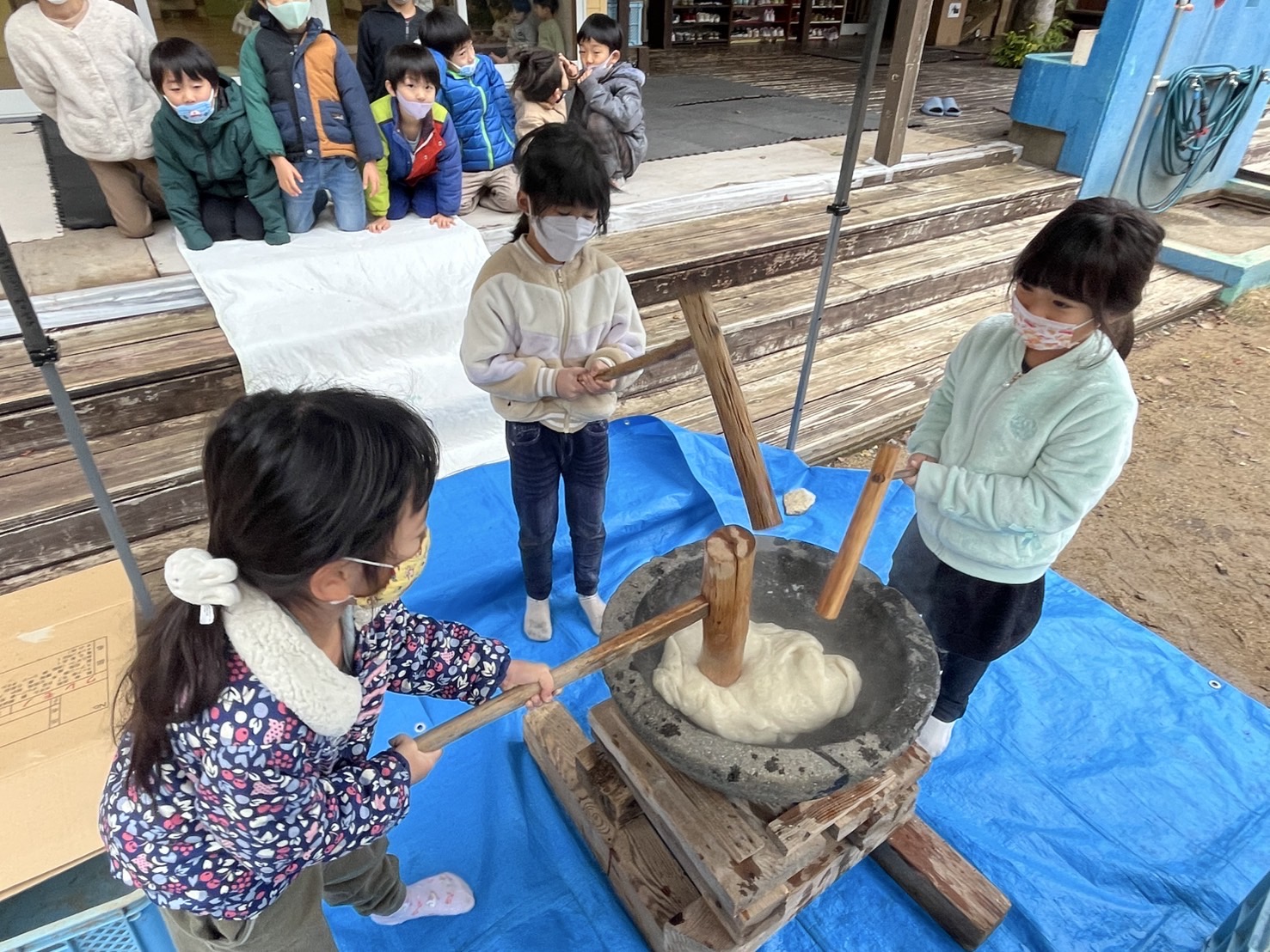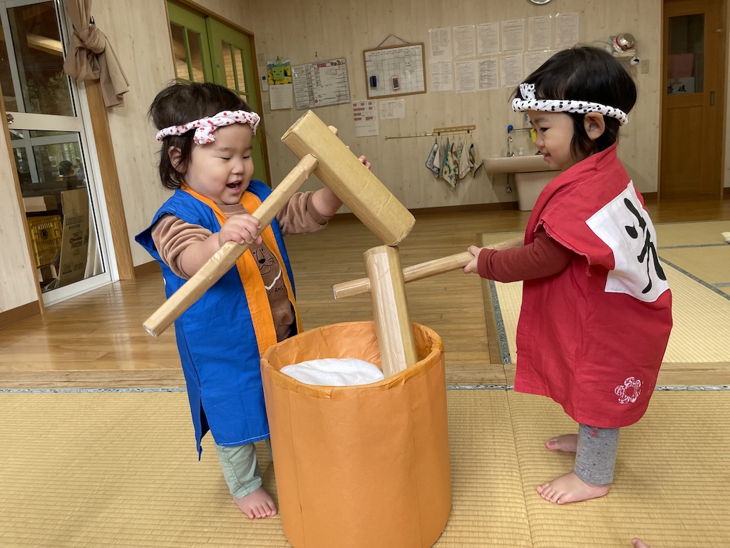 感染症対策の為、延期になっていたもちつき会をようやく実施することができました(*_*) 園でのお餅の提供は難しくなっていますが、昔ながらの伝統的なもちつきをたのしく体験したり、見学したりすることを目的にひかり保育園では毎年もちつき会を行っています(*^-^*)まずは園長先生と副園長先生のお手本!!子ども達大注目!!( *´艸`)以上児さんは順番に気合を入れてもちつき(*^-^*)「よいしょー!」と元気なかけ声も飛んでいましたよ!以上児さんは自分がついて、丸めたお餅もお土産で持ち帰りました( *´艸`) 未満児さんはお部屋でもちつきごっこ☆赤と青のハッピを着て、段ボールで作った杵と臼、タオル生地のお餅で大盛り上がり(#^.^#)毎年未満児さんのもちつきごっこ!とってもかわいいんです(*^-^*)昼食には園庭で大鍋調理した七草粥!春の七草たっぷり!みんなおかわりして食べていました!今年も子ども達が元気に過ごせますように!!★令和7年度1月4日(土) ごあいさつ(*^-^*)