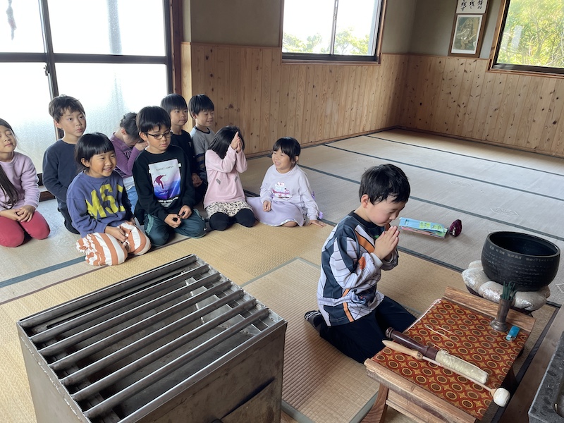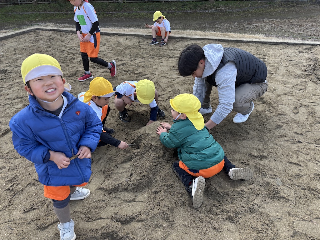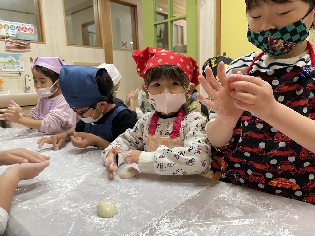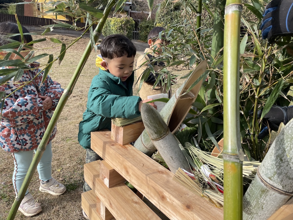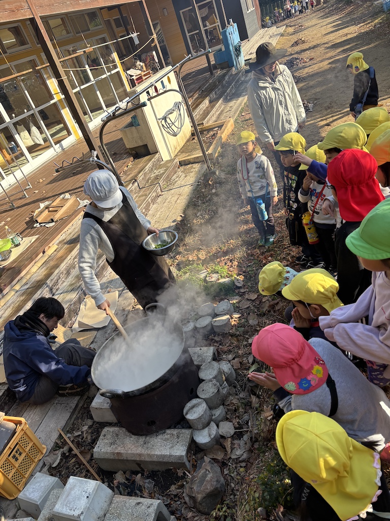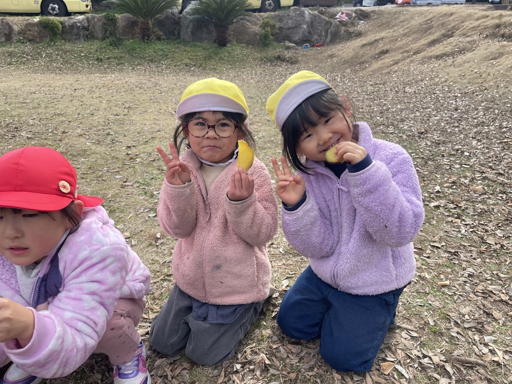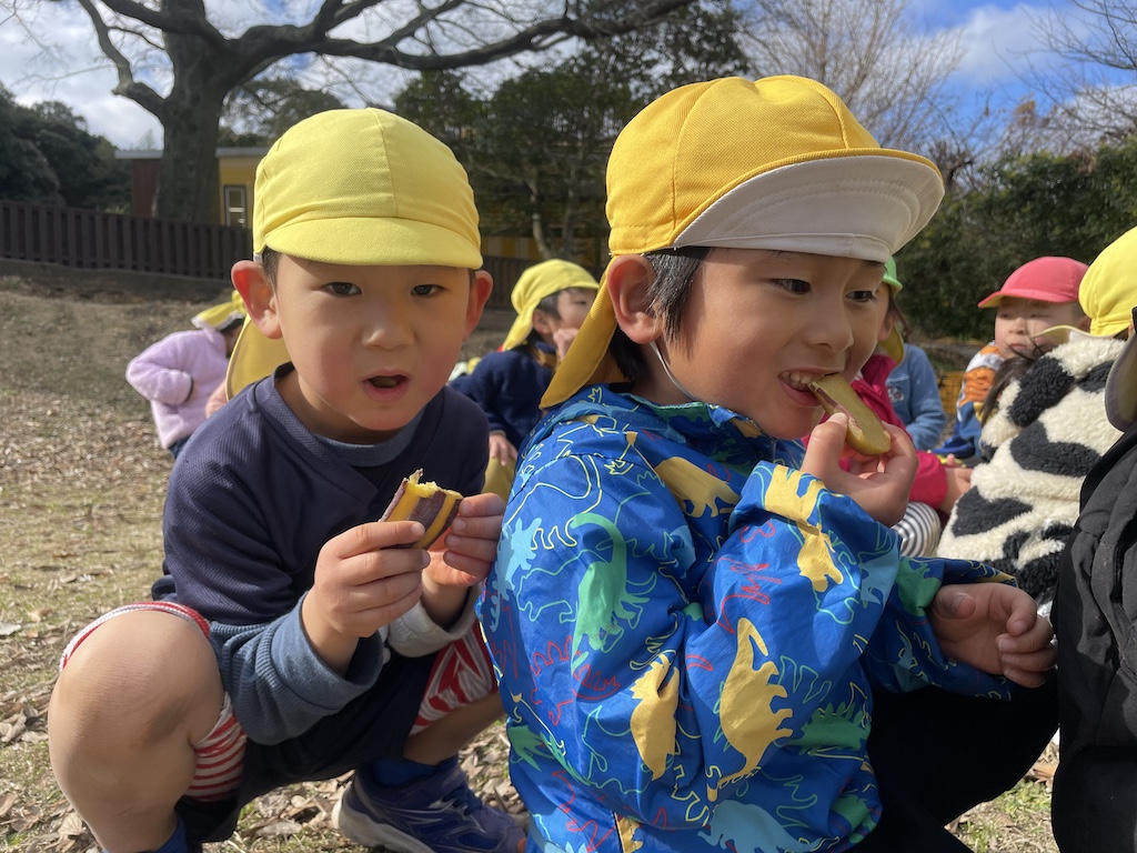いつもみんなが走り回っている広場の真ん中にやぐらを組み竹や正月飾りを入れ、準備万端(^^)/燃えた竹がパーン!!と大きな音をたてて弾けると、「おんのほね~!!(鬼の骨)」と邪気を払う掛け声(*^-^*)みんな元気いっぱい叫んでいました。煙を浴びて、鬼火で焼いた干し芋を食べた子ども達はこの1年きっと丈夫な心とからだで過ごせることでしょう( *´艸`)火のあたたかさ、煙の匂い、パーン!と鳴る音など、子ども達の五感が存分に刺激された時間でした!