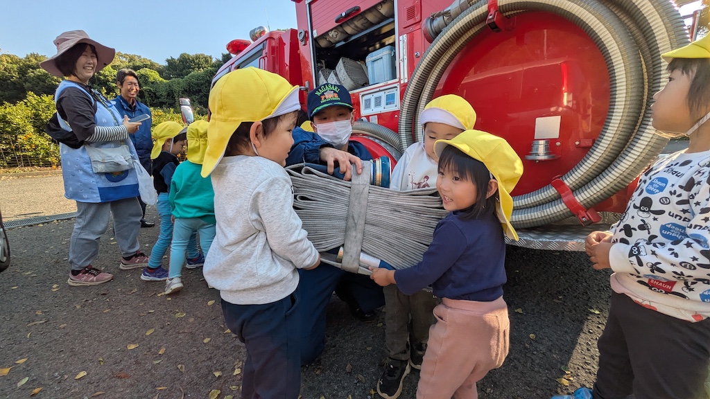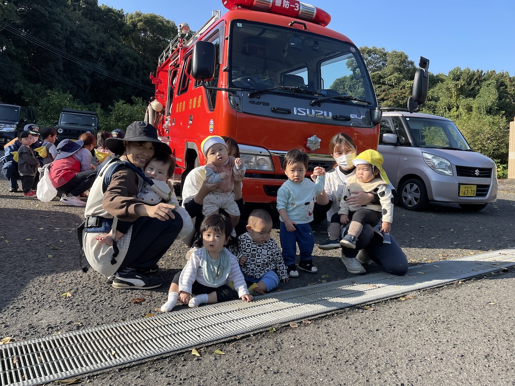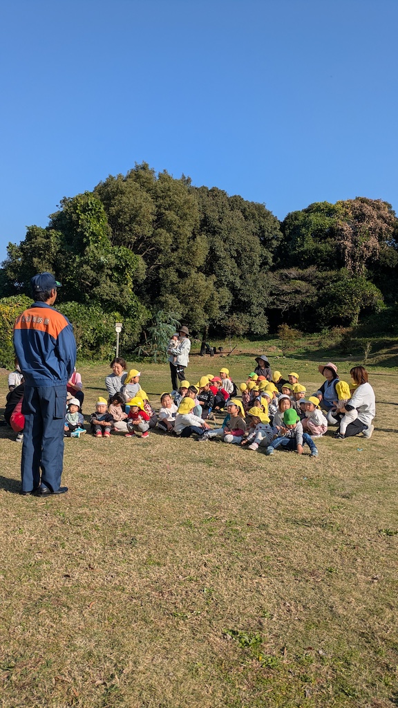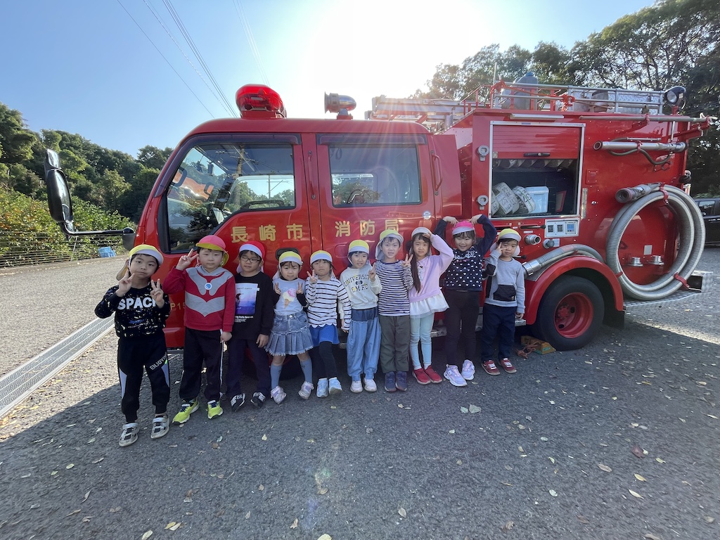 ひかり保育園では、毎月避難訓練を行っていますが、年に1度消防署立ち合いの避難訓練。があります。今年度は11月に消防浜田出張所の消防士さんに来ていただきました(*^-^*)