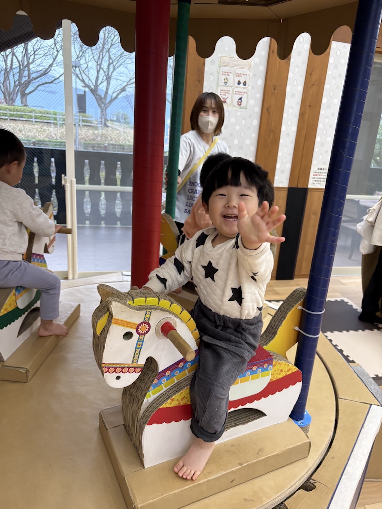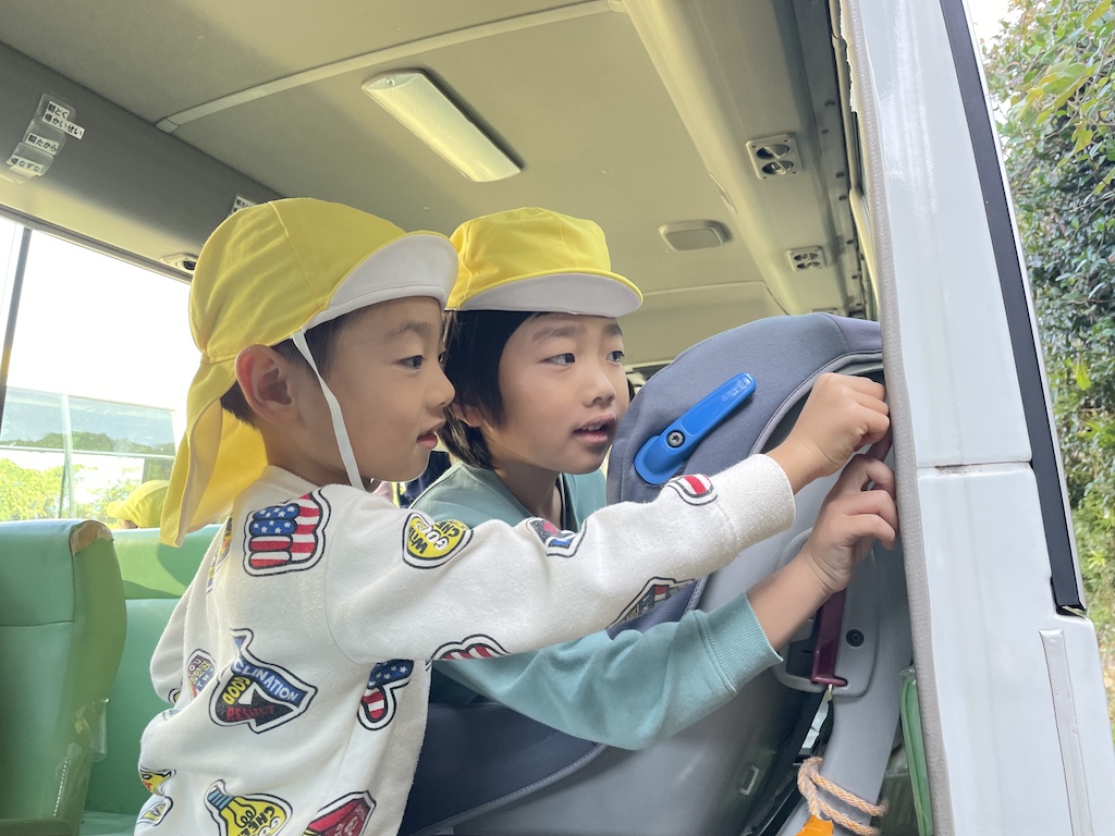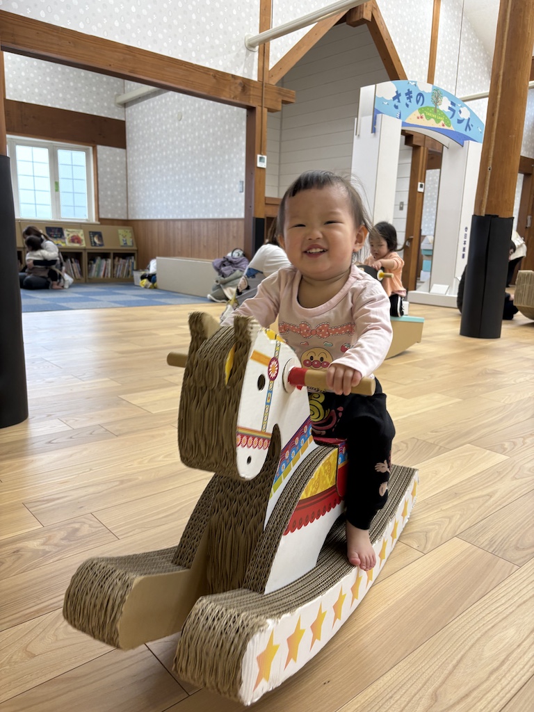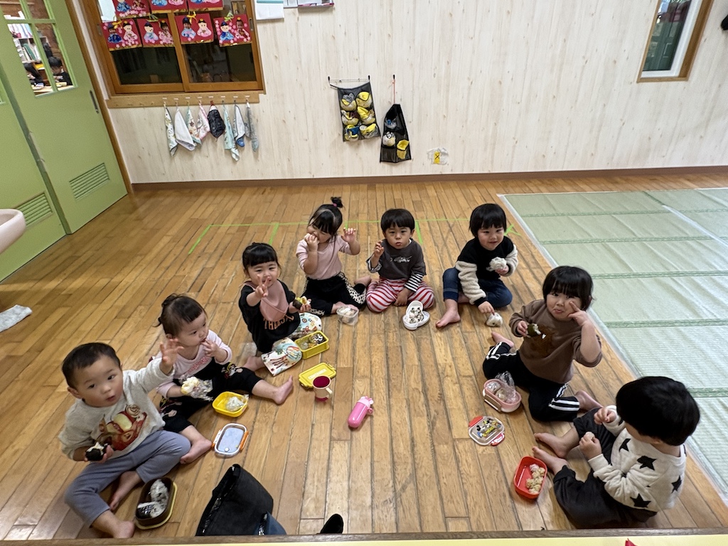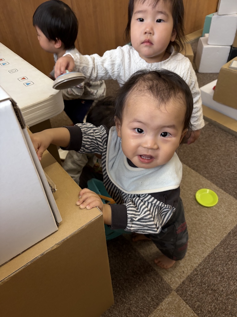 今日はとまと組、きゅうり組さんの園外保育の日です(*^-^*)『さきのランド』へ遊びに行きました!とまと組さんはバスに乗って初めての園外保育でした( *´艸`)さきのランドのプレイルームには段ボールで作られた遊具があって、みんなワクワク嬉しそう♪全身を使ってシーソーを揺らしたり、段ボールでできたメリーゴーランドの木馬にまたがって「動かして~♪」とリクエストし、動き出すととってもいい笑顔を見せてくれました(*^-^*)たくさん遊んだその後は保育園へ戻っておにぎりタイム!!みんなお腹が空いていた様で大きなお口であっという間に完食でした( *´艸`)手作りおにぎりの準備ありがとうございました!