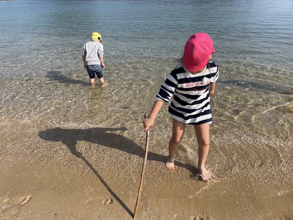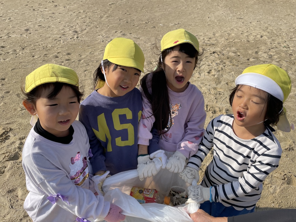 前回の魚食活動では海洋プラスチックを使ってアクセサリー作りと楽しみながら海に沢山のゴミが流れついていることを知りました。そこで今回は、海の生き物を大切にする気持ちや海を綺麗にする意識を高めることに繋がってほしいなと思い、結の浜でゴミ拾いに取り組んできました。集中してゴミを拾い、「ペットボトルのキャップが多いね」「お菓子の袋もある」など観察しながら拾う姿が見られ、ゴミ拾いの後は砂浜で貝拾いをしたり、12月とは思えないほど暖かい日差しのなかで海に足を浸けて魚やヤドカリを見つけて楽しみました( *´艸`)砂浜で遊んでいる途中も「あ!ゴミ」と拾う姿もありましたよ(#^.^#)