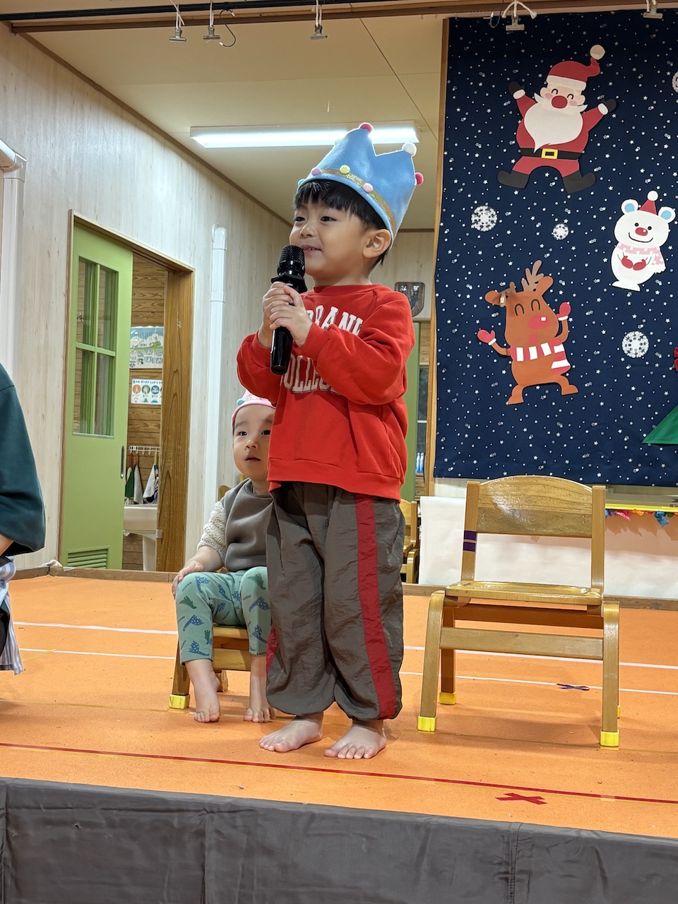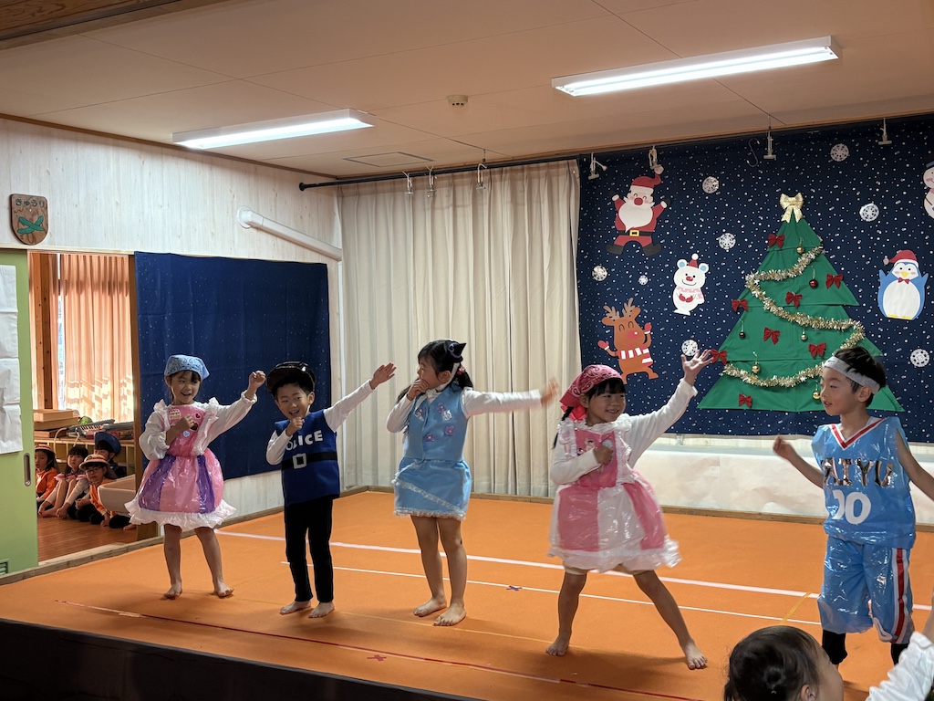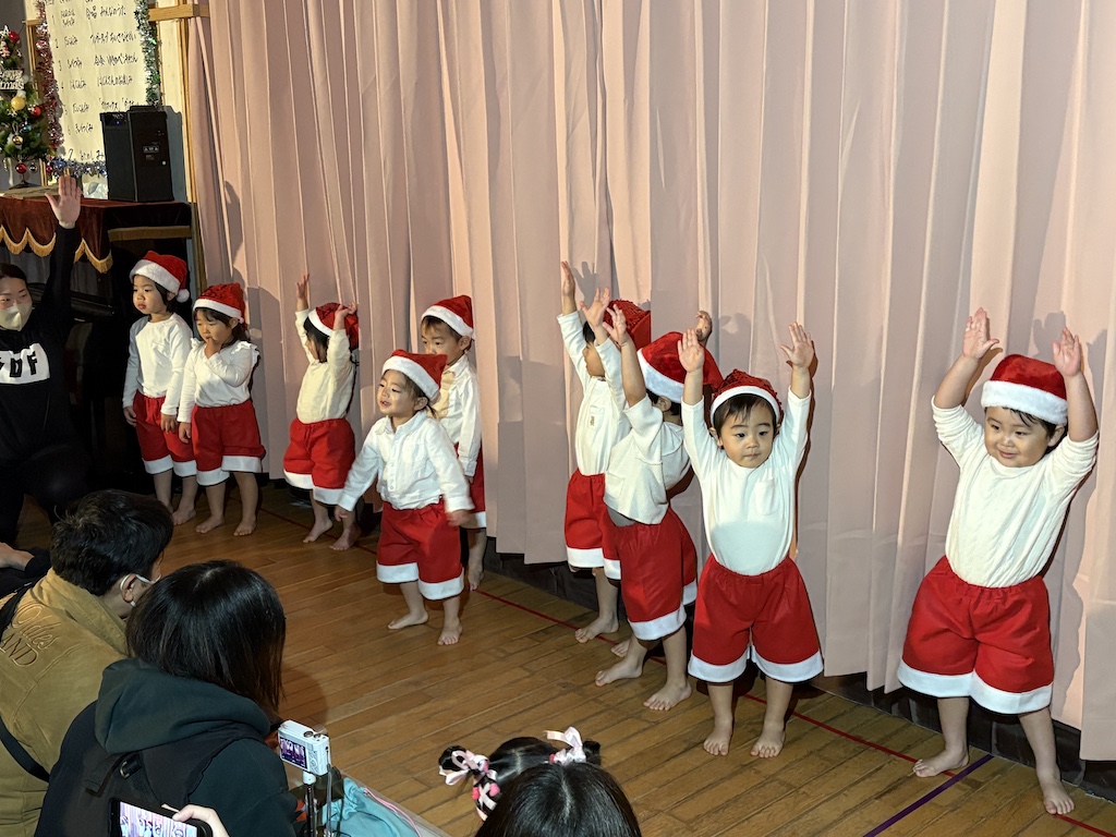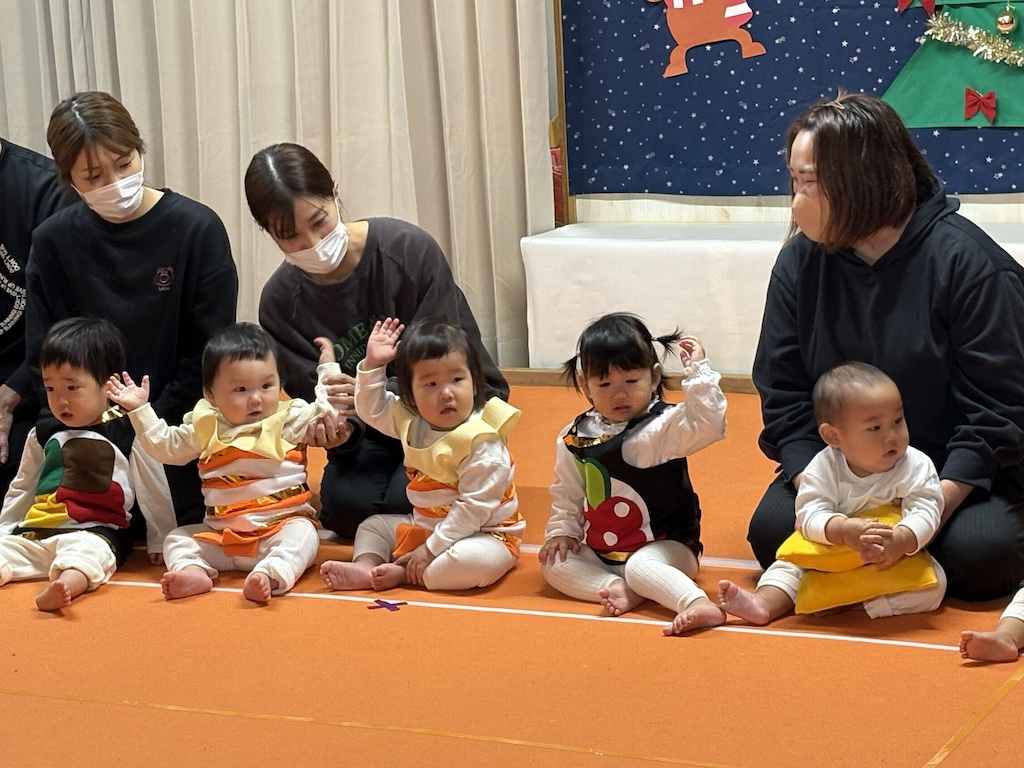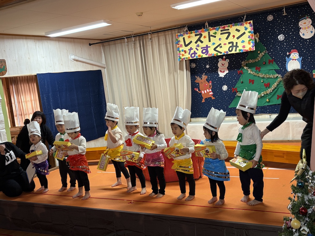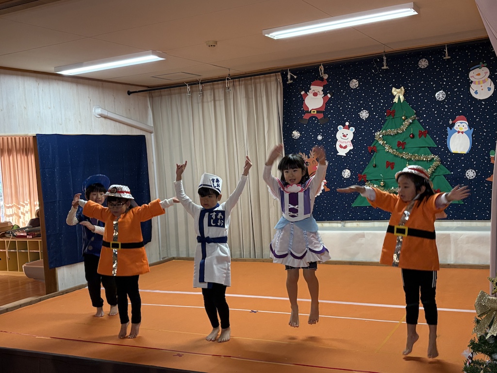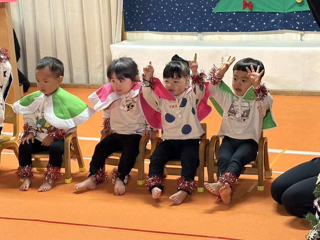 未満児の部、オープニングはなす組さんの『ちょっとだけ体操』とっても緊張していた子ども達も、この曲がかかるといつものいい笑顔( *´艸`)楽しむ子ども達を見て頂けて…私たちも嬉しいです!とまと組さんは可愛いお寿司に変身。きゅうり組さんはお買い物に挑戦!!なす組さんはコックさんに変身です( *´艸`)未満児さんのクリスマス会は舞台に立ってるだけでかわいいですね!いつも通りの姿を見せてくれる子、緊張で固まる子(*^-^*)それぞれでしたが、たくさんの観客の前でも涙することなく発表を終えることができましたよ☆