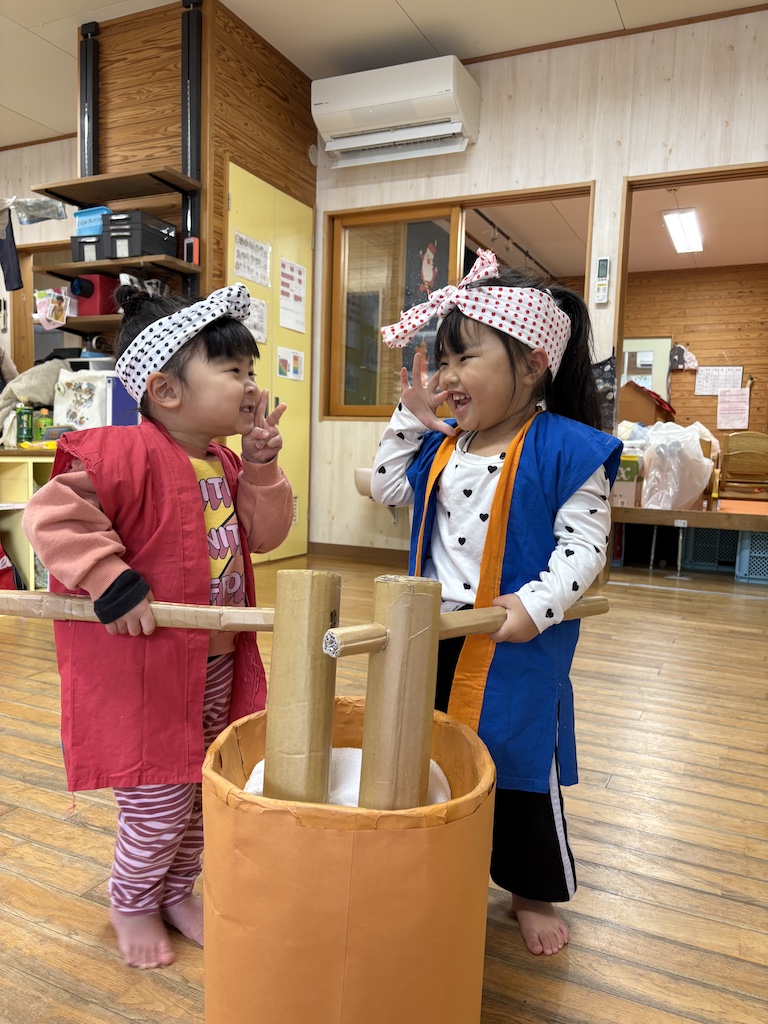未満児さんは手作りの臼と杵で餅つき体験( *´艸`)これがまたかわいい!!!ハッピにねじり鉢巻きを決めてこちらも大盛り上がりでした!