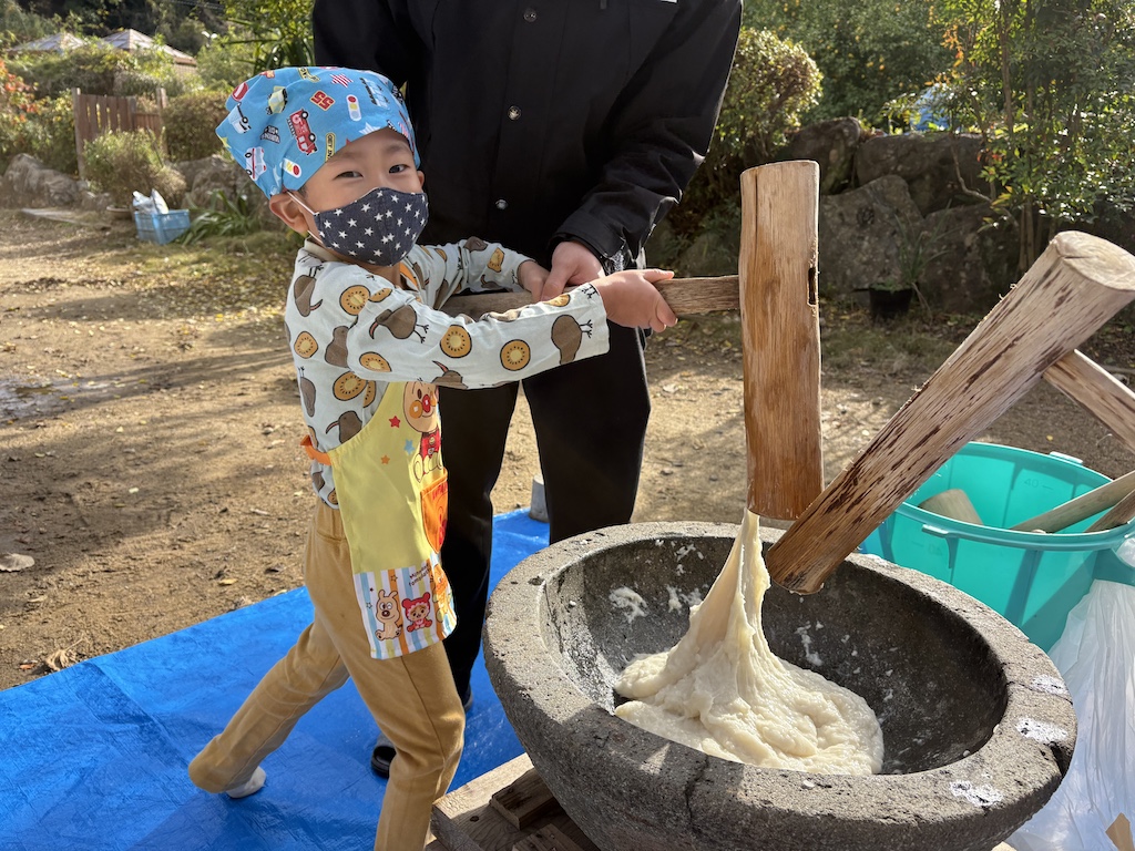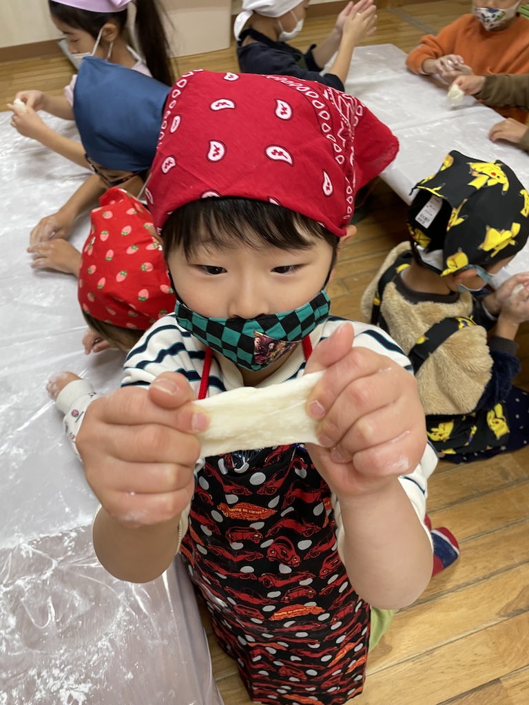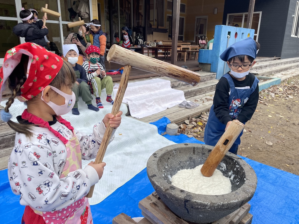 蒸したもち米をみんなでついておもちを作ります(*^-^*)園ではおもちの提供はしていませんが、お正月を迎える準備として、日本の伝統的な年末の行事をみんなで体験します(‘ω’)石臼、杵を準備してさぁ!もちつき開始です(‘ω’)ノ力のいるコネ作業は力持ちの先生達で…子ども達は大きな声で「がんばれー!」と応援してくれます(*^-^*)子供用の杵で以上児さんも餅つきに参加しました!気合十分の子、控えめにつく子、個性溢れるもちつきはとっても楽しいです(^^♪ついたおもちはみんなで丸めて、お土産に持ち帰りました!