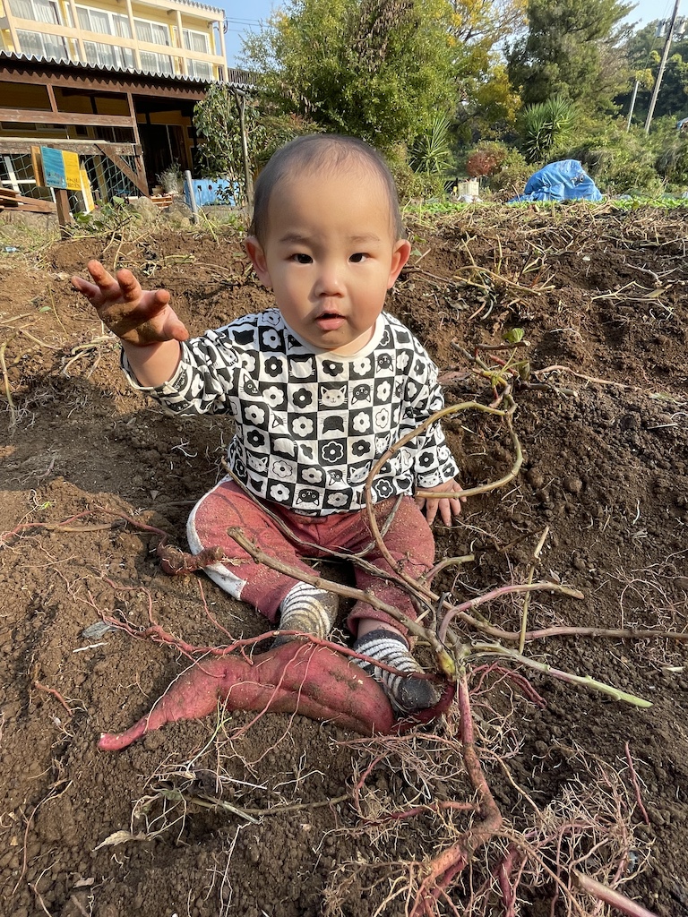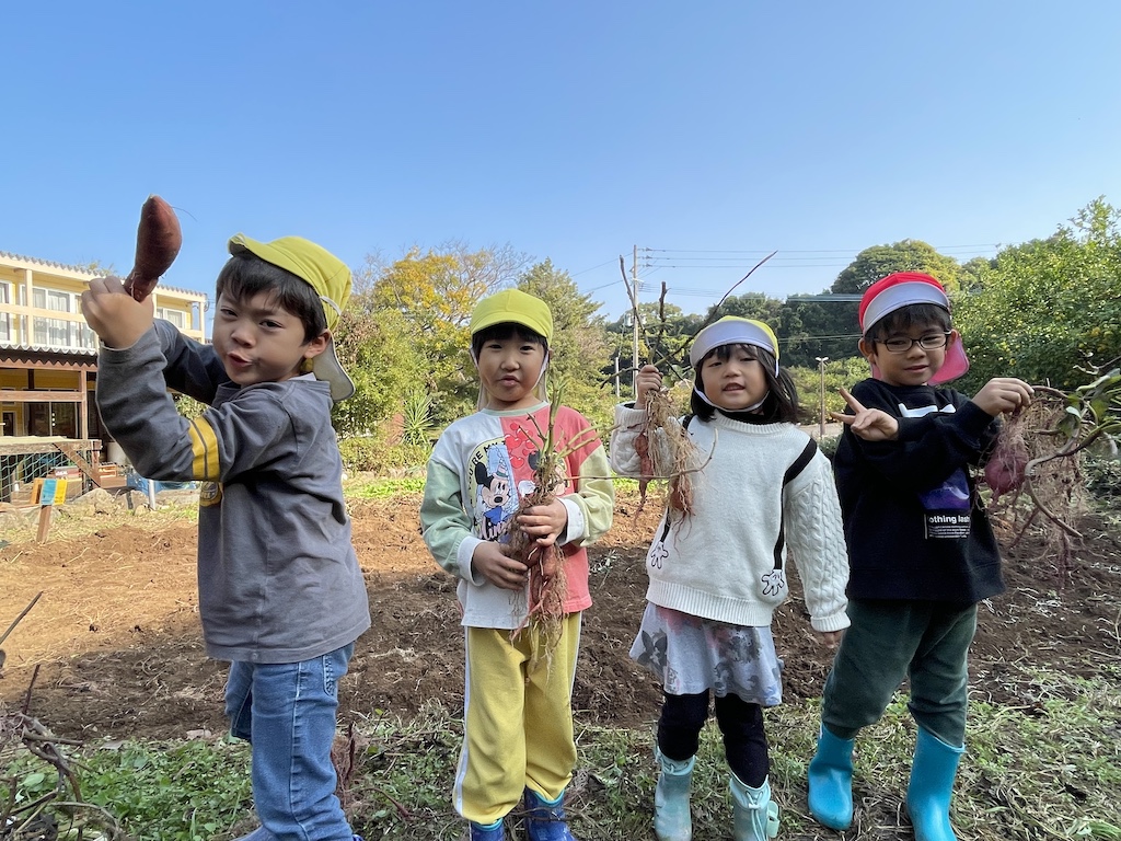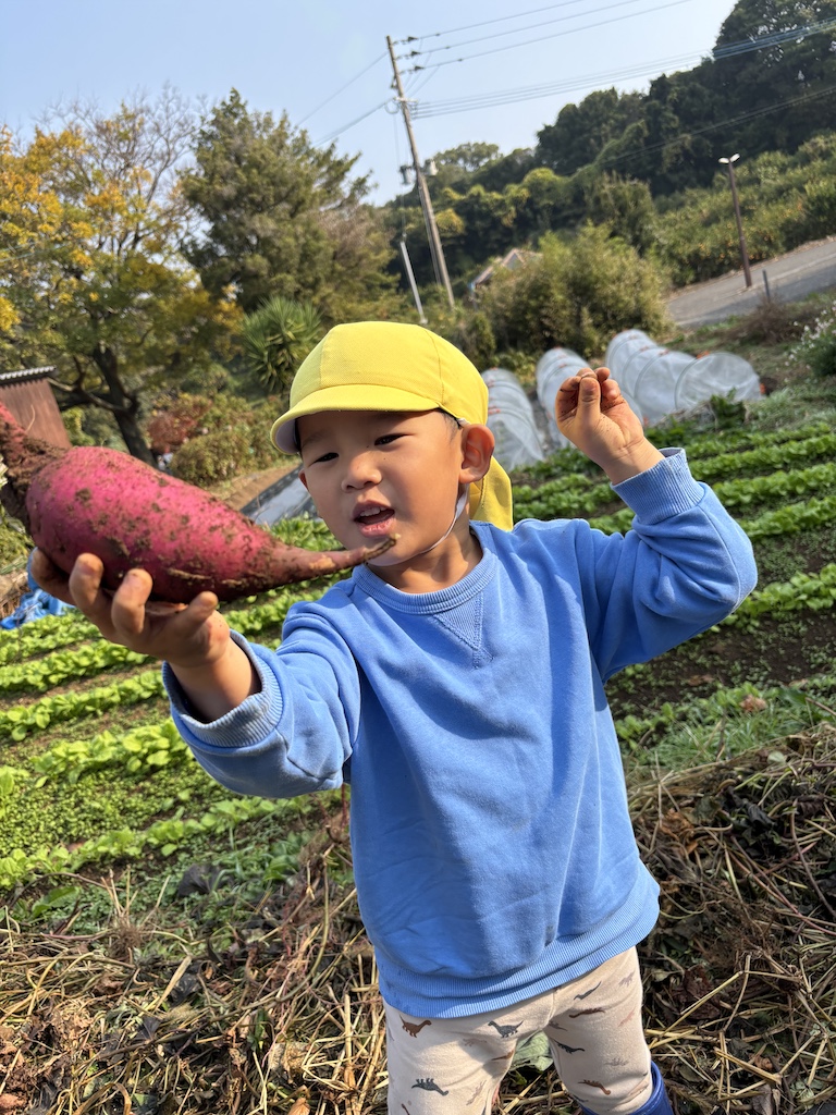 今日はみんなでお芋掘りをしました( *´艸`)小さいクラスのお友達から順番に畑に入り、少しだけ顔を出しているお芋を掘り出します。うんとこしょどっこいしょ!と力を込めて引っ張りお芋をゲットすると、「とれた!」「いっぱいついてるよ!」と大興奮の子ども達(#^.^#)なかなか出てこない恥ずかしがり屋のお芋を見つけるとお友達と協力して掘ったり、お芋を片手にポーズを決めたり楽しんでくれていました!!今年は数が少なめでしたが、大きいお芋が採れて嬉しそうでした(^^♪掘ったお芋はしばらく休ませてから、お給食やおやつでいただきます!