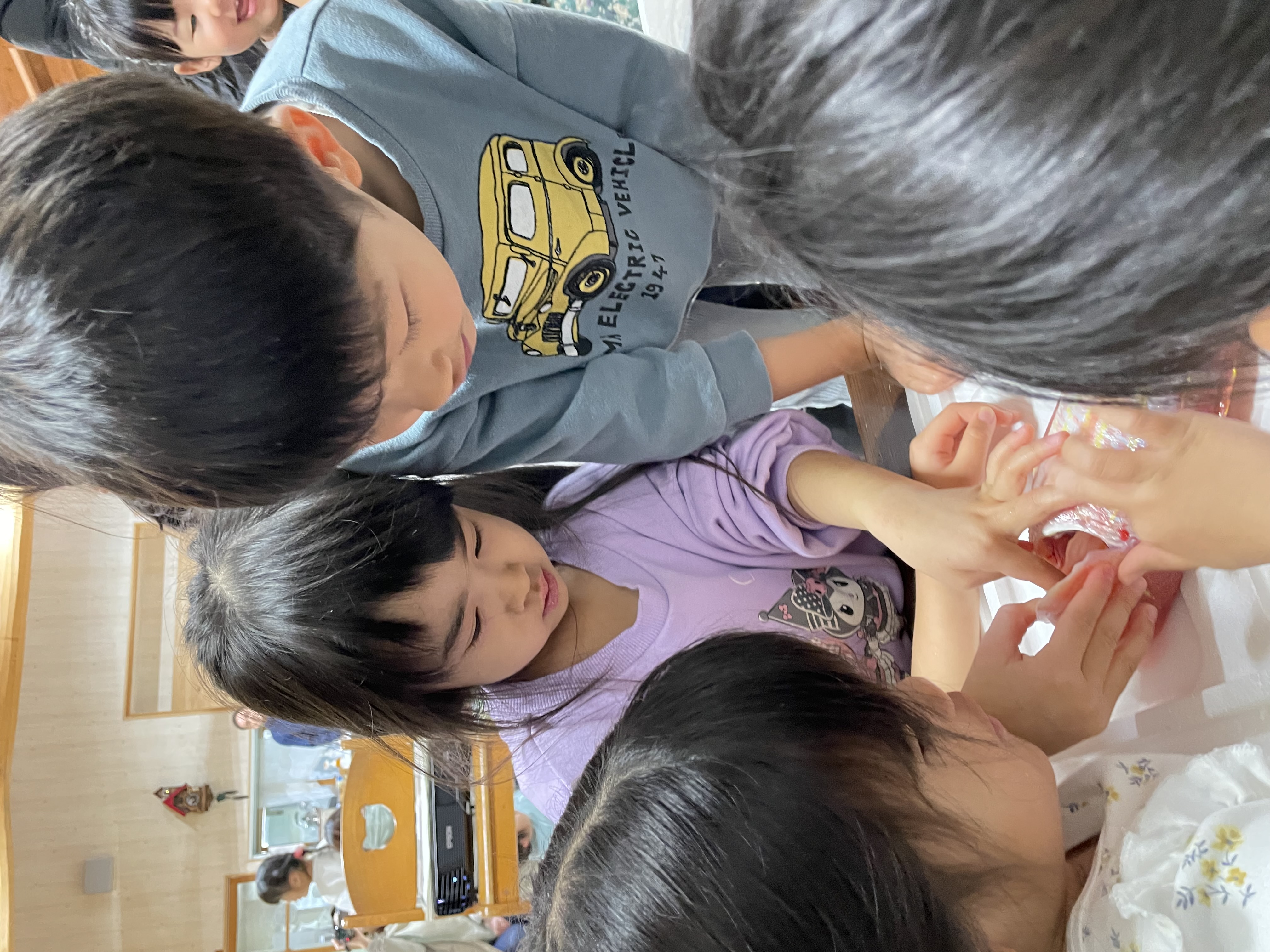 変身し…握ってもトロトロに( *´艸`)手に塗ったり…指先から垂らしてみたり…不思議な感触にみんな夢中で遊んでいました!たくさん遊んだその後はみんなのお楽しみ!おにぎりタイム!!毎月おにぎりのご準備ありがとうございます(#^.^#)