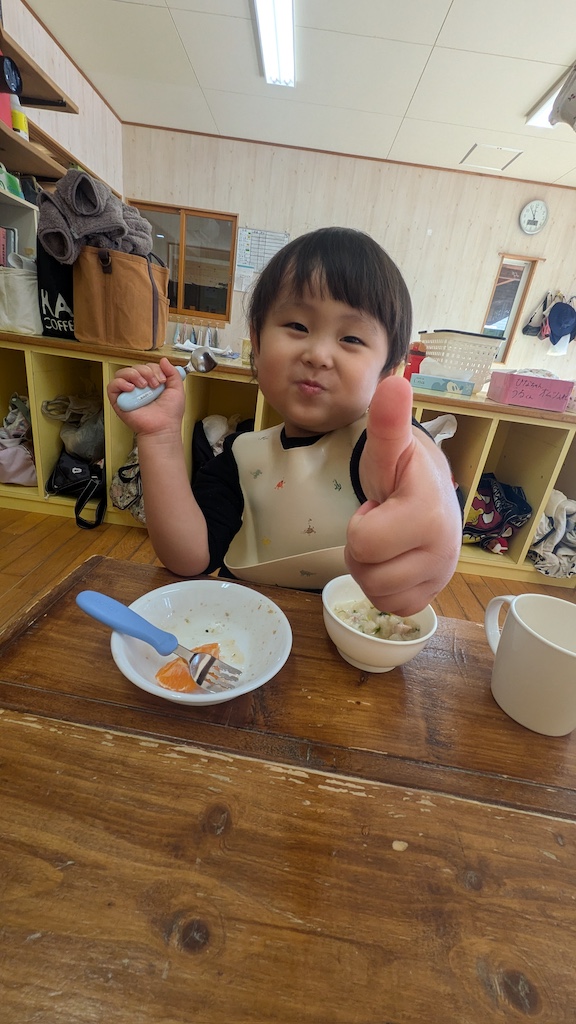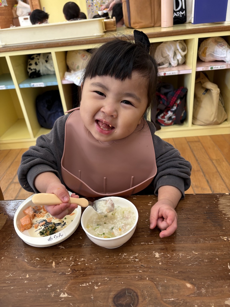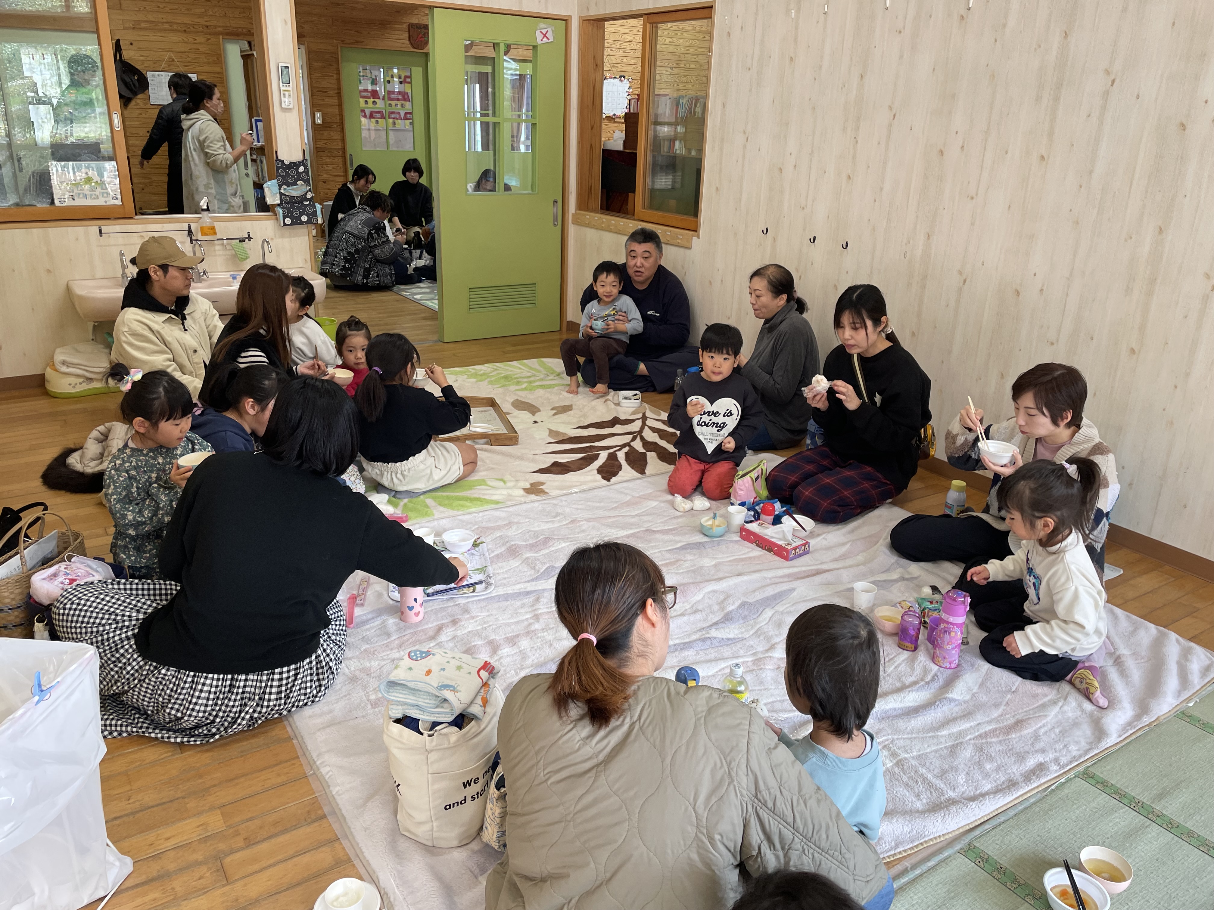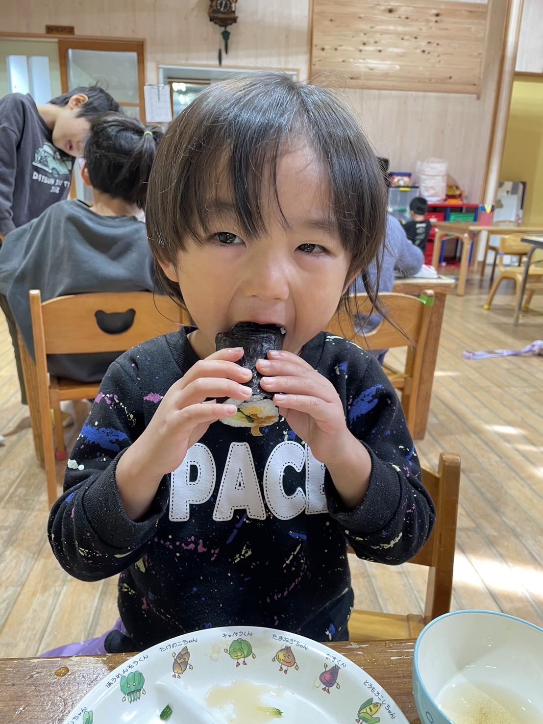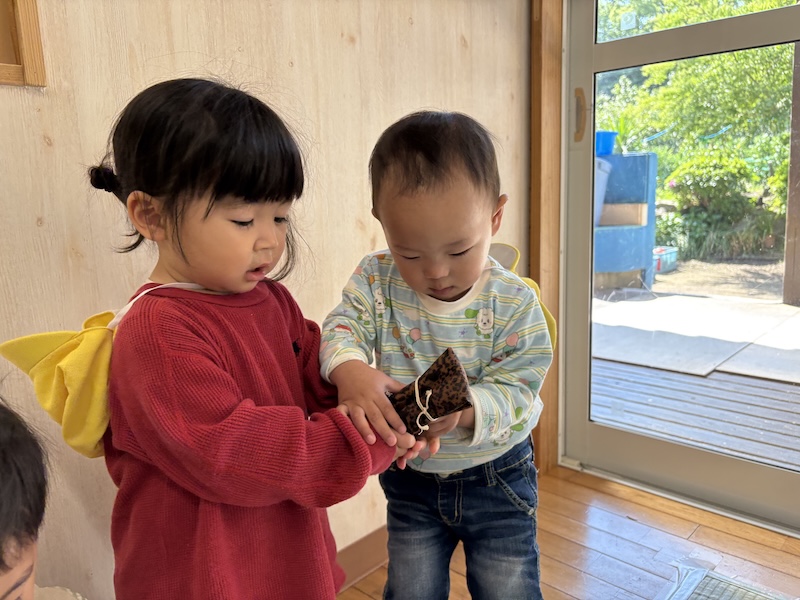 きゃべつ組さんは工作にチャレンジするお友達もいました(*’▽’)施設の方に手伝っていただきながら、思い思いの素敵な作品を完成させていましたよ。沢山遊んだ後は…戸外で昼食の予定だったのですが…(;^ω^)本日は戸外がとっても寒かったので…室内で昼食(*^-^*)毎月美味しいおにぎりを作って下さるお家の方に感謝しながら…みんな笑顔で完食していました!おにぎりの準備ありがとうございます!!