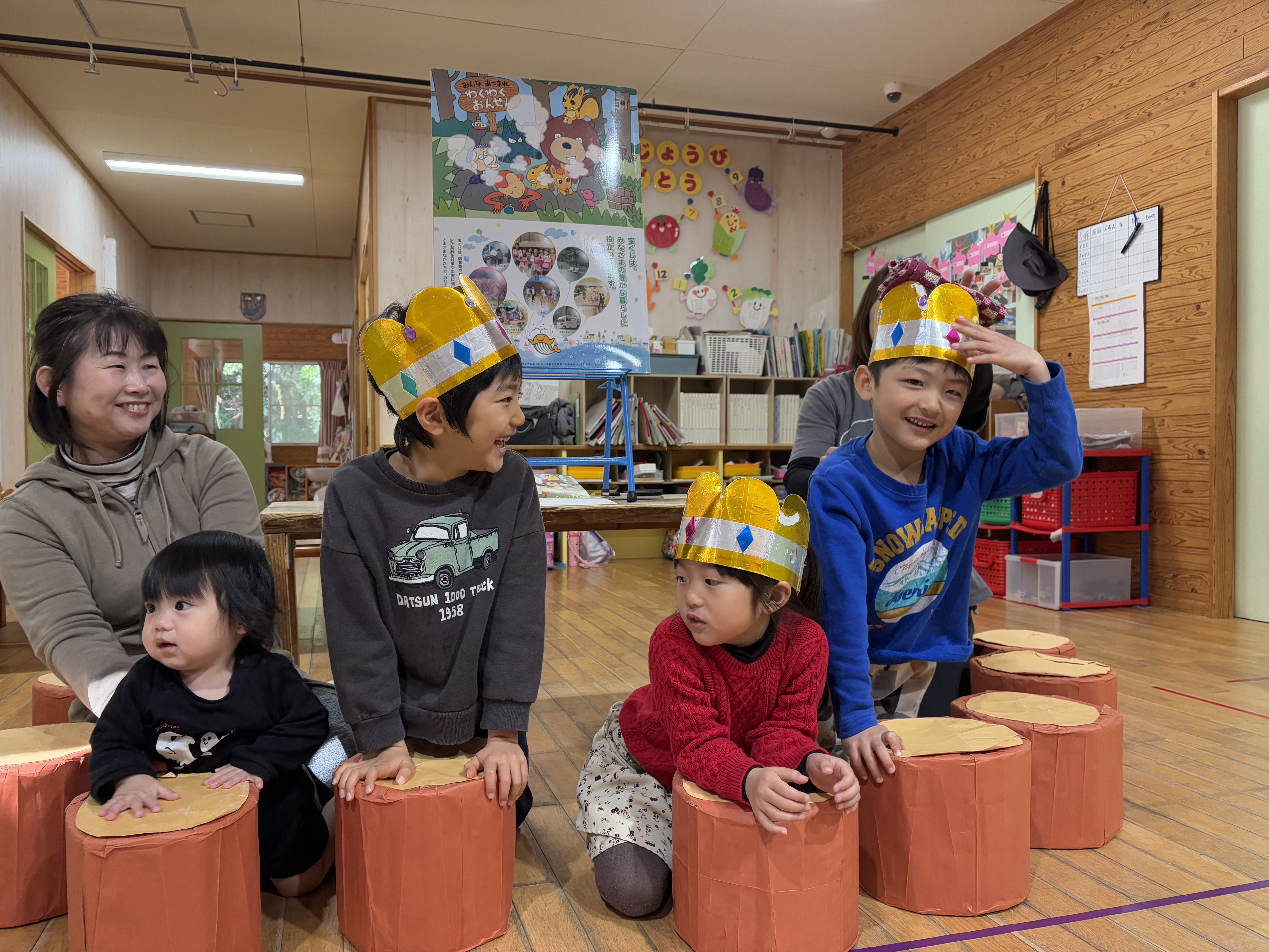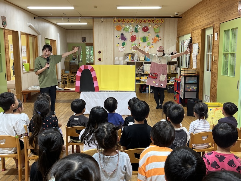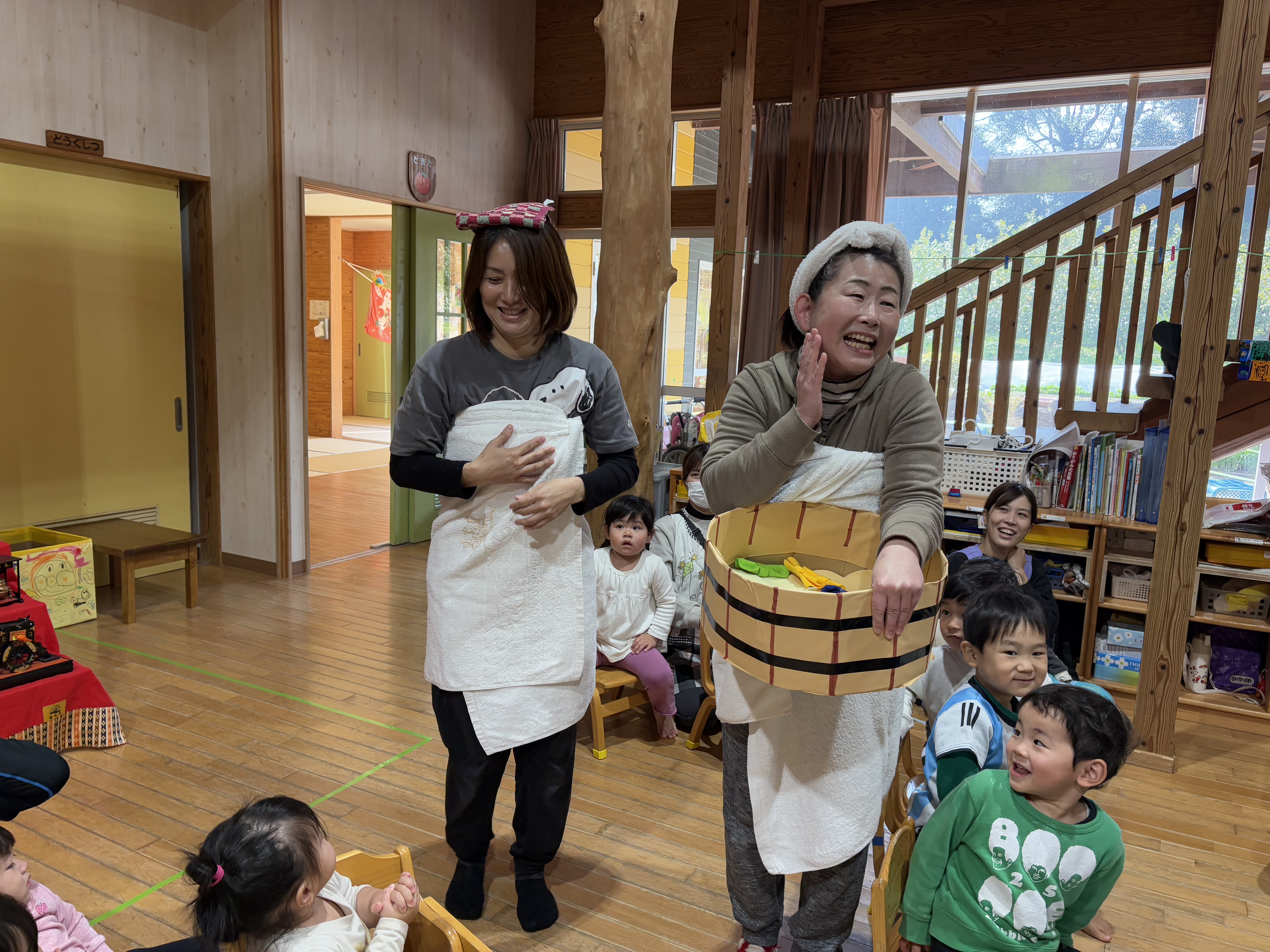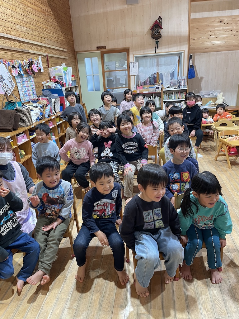 今月は4名のお友達がお誕生日でした(^^♪とまと組のお友達も保育士と一緒に歩いて入場!!とってもかわいい入場にみんな笑顔になりました!だいこん組、きゃべつ組のお友達は自己紹介もバッチリ( *´艸`)さすがです!先生たちからのプレゼンとは『わくわくおんせん』の大型絵本。絵本を楽しんだ後には、温泉を探す2人(保育士)が登場…みんな大盛り上がりでしたよ( *´艸`)2月のお誕生日のお友達も温泉に入り、ポカポカに温まった誕生会となりました☆2月生まれのお友達!!お誕生日おめでとう!これからも元気にのびのび大きくなってね(^^♪