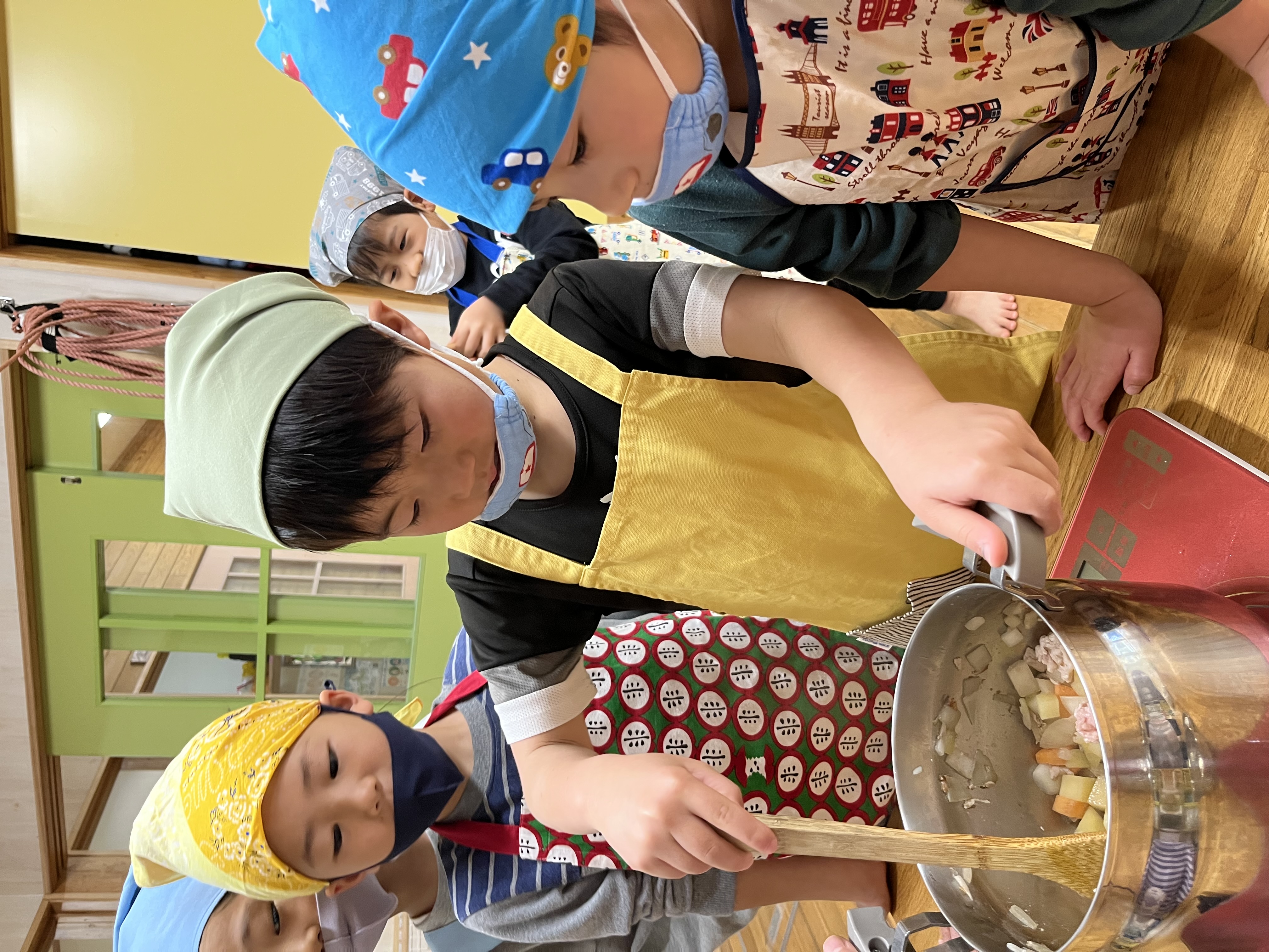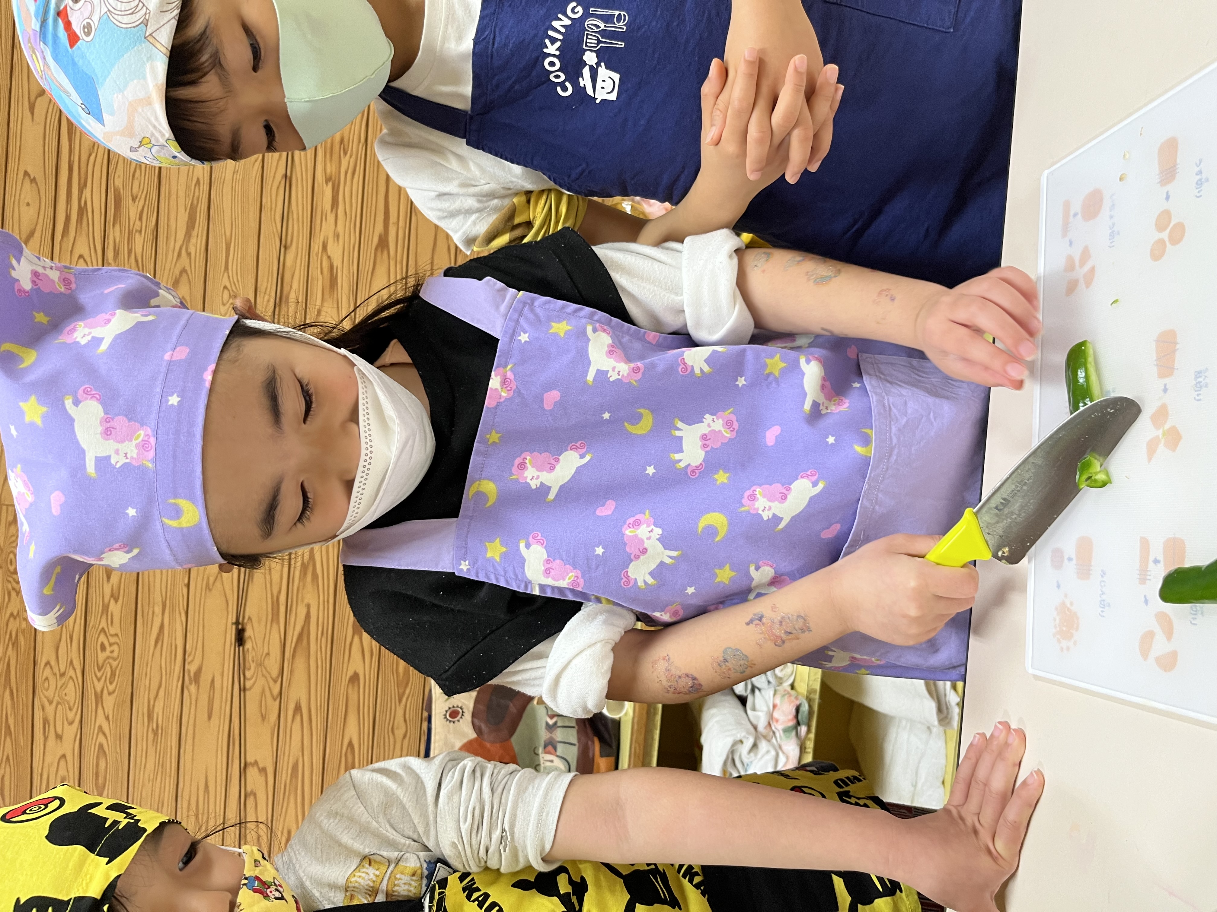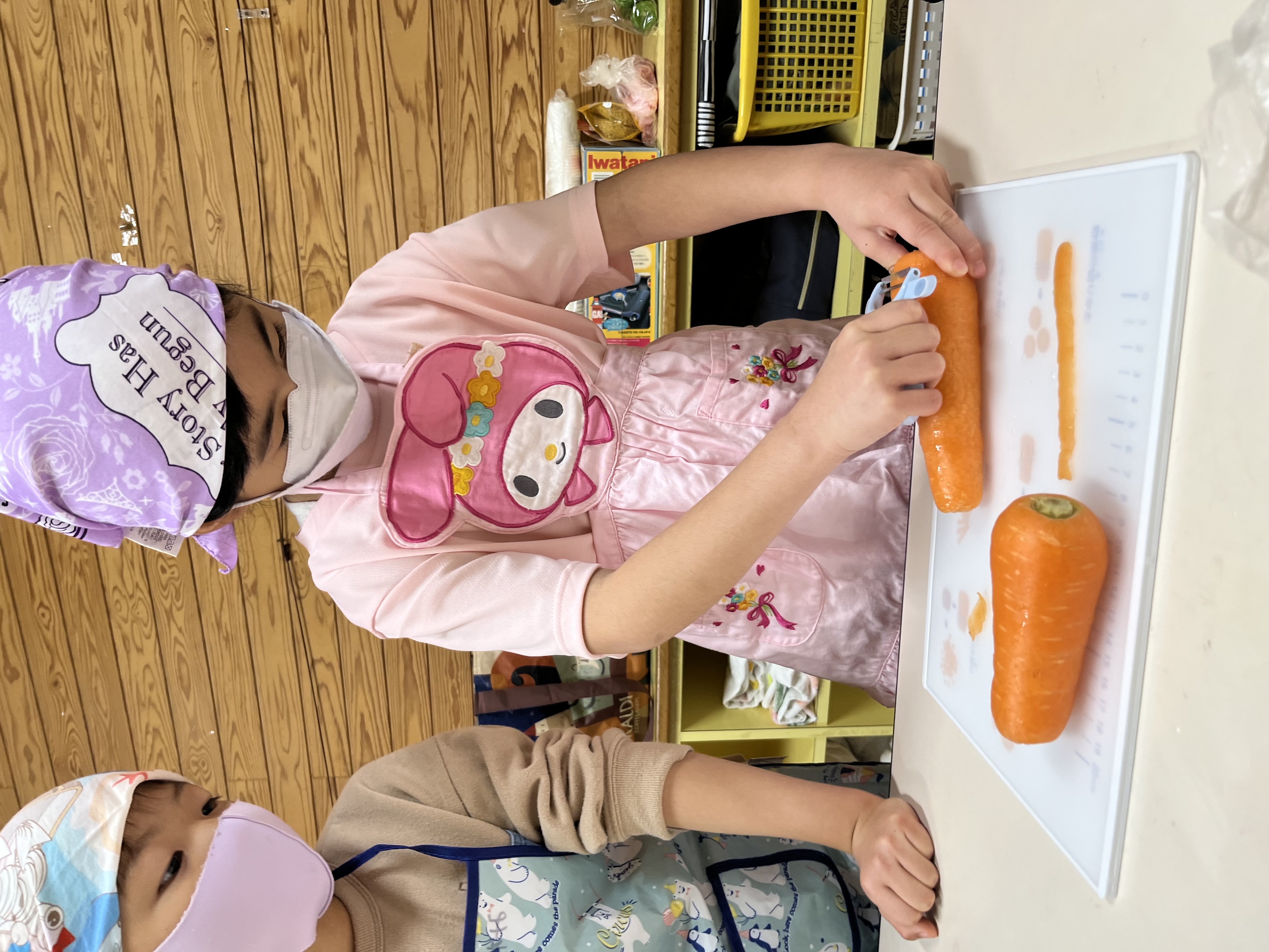 それぞれエプロン三角巾で変身したら…手順の説明を聞きます。みんな興味津々集中して聞けていました(*’▽’)いよいよ下ごしらえです。ピーラーで野菜の皮を剥いたり、包丁で切ったり!怪我に気を付けながら頑張りました。お米の研ぎ方も教えてもらいました!