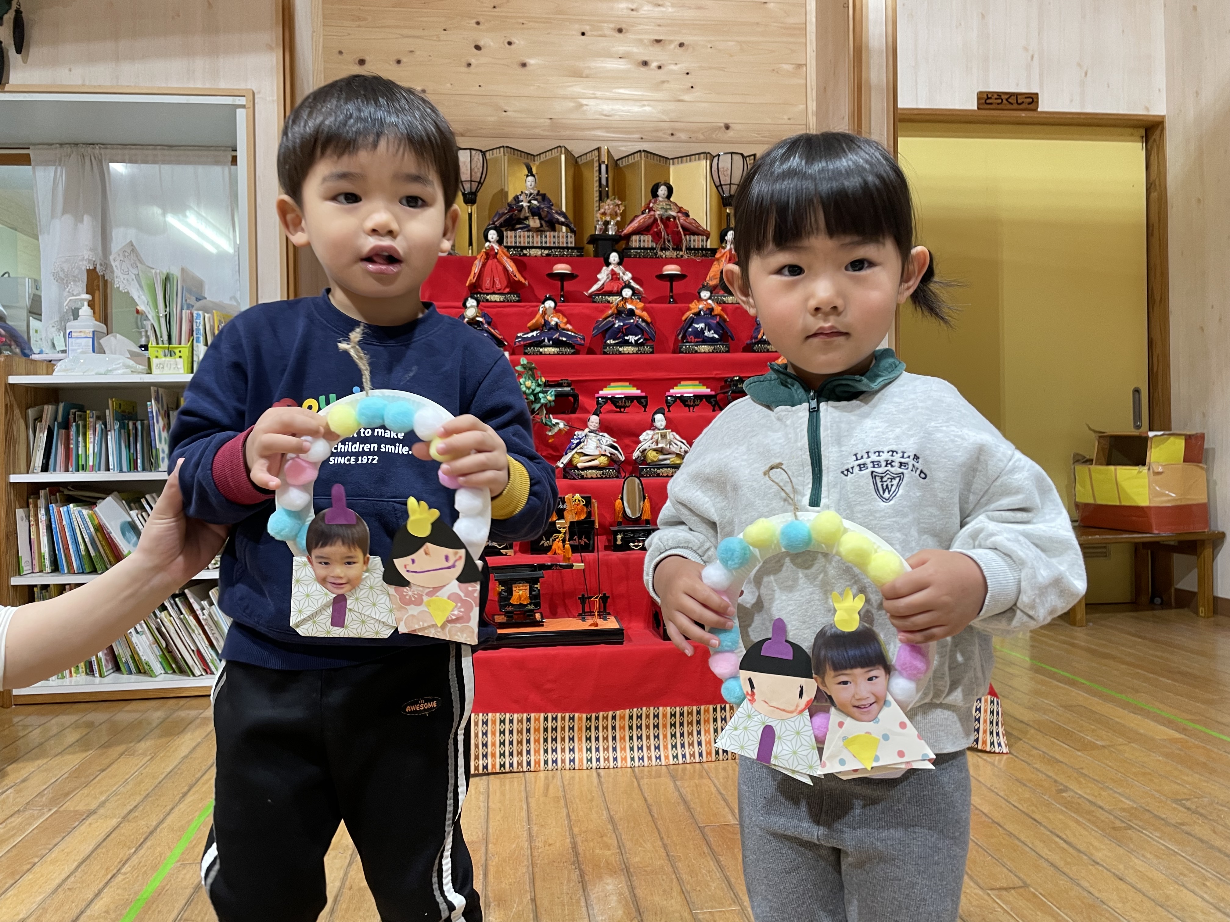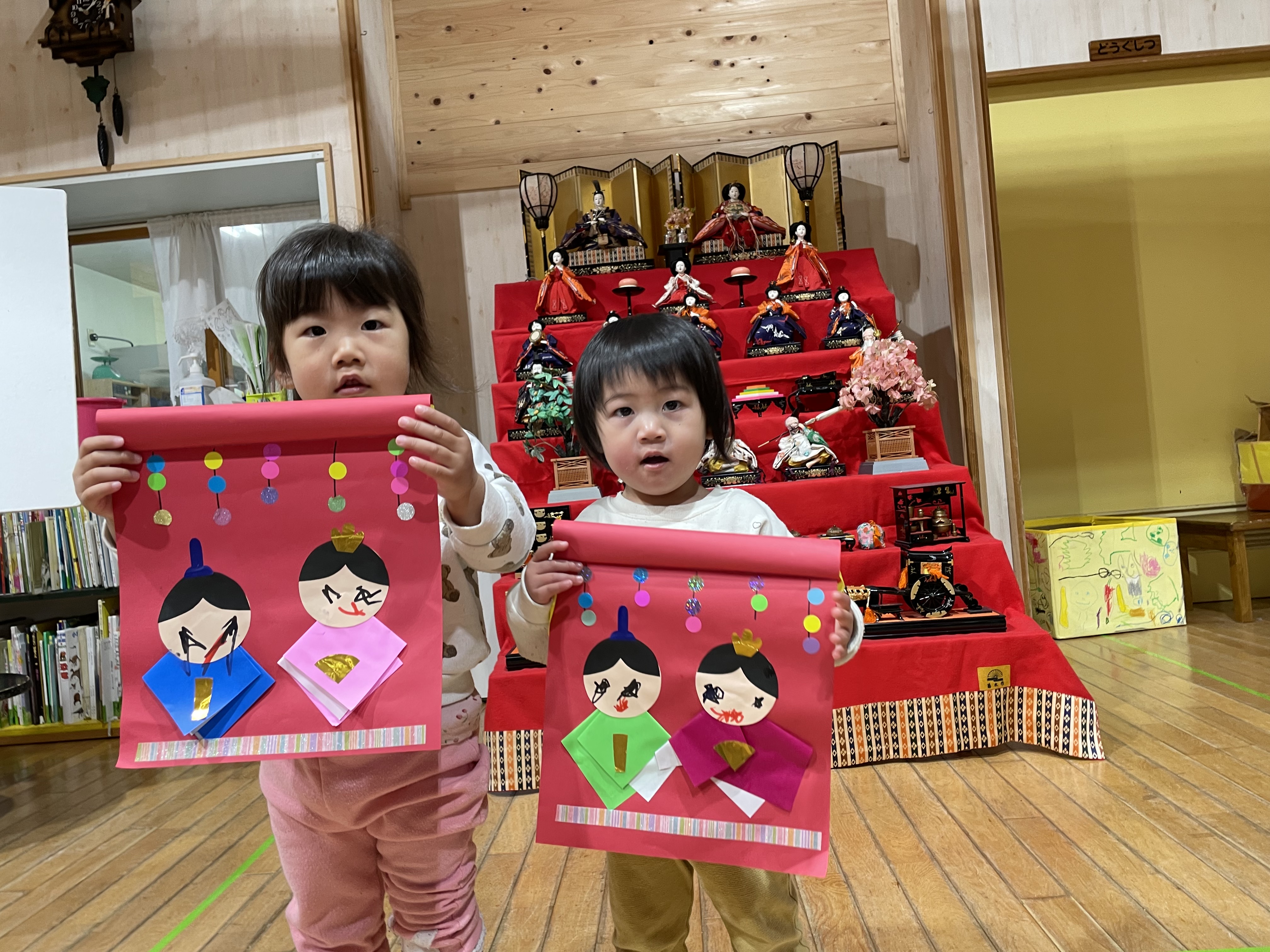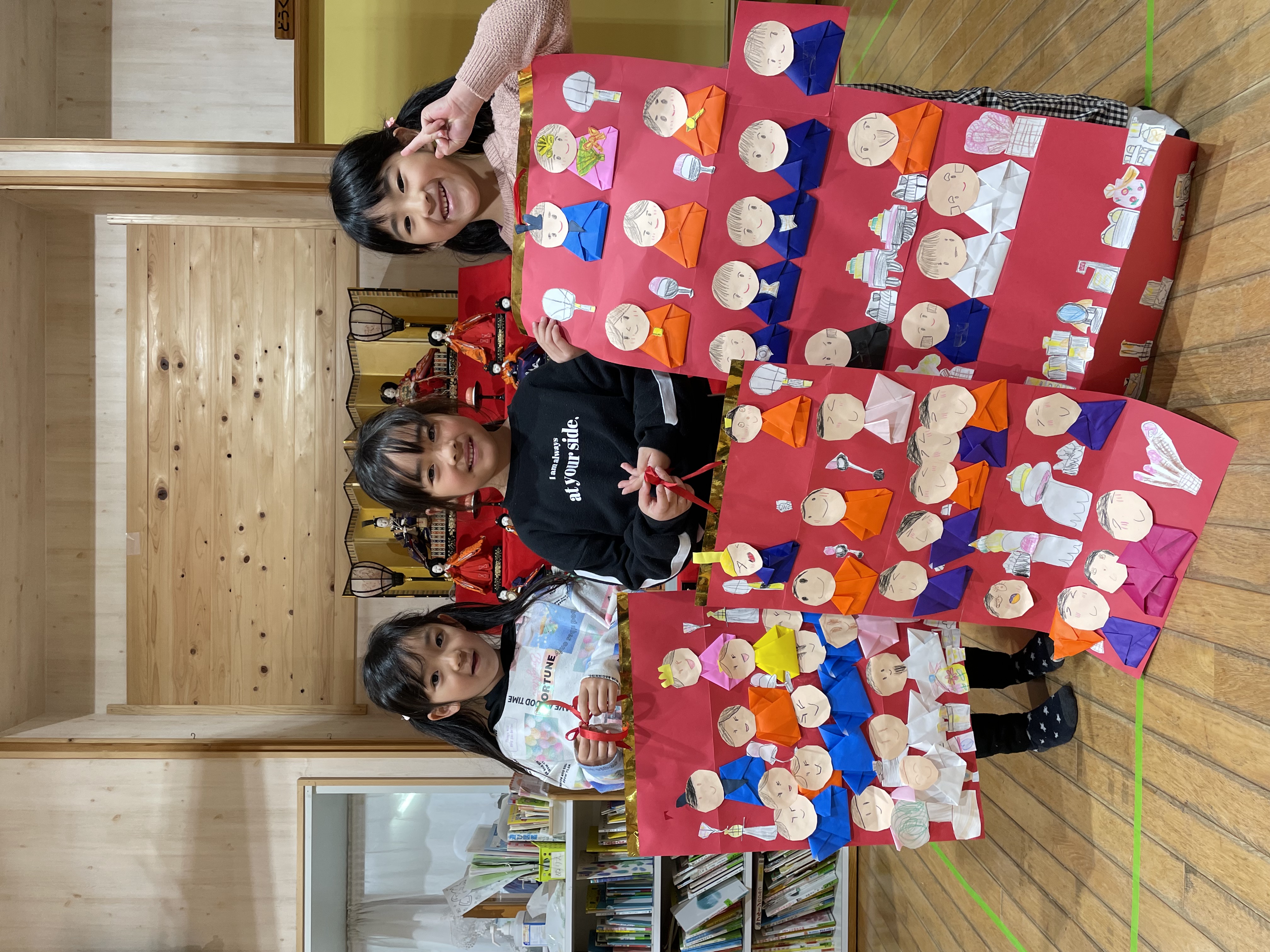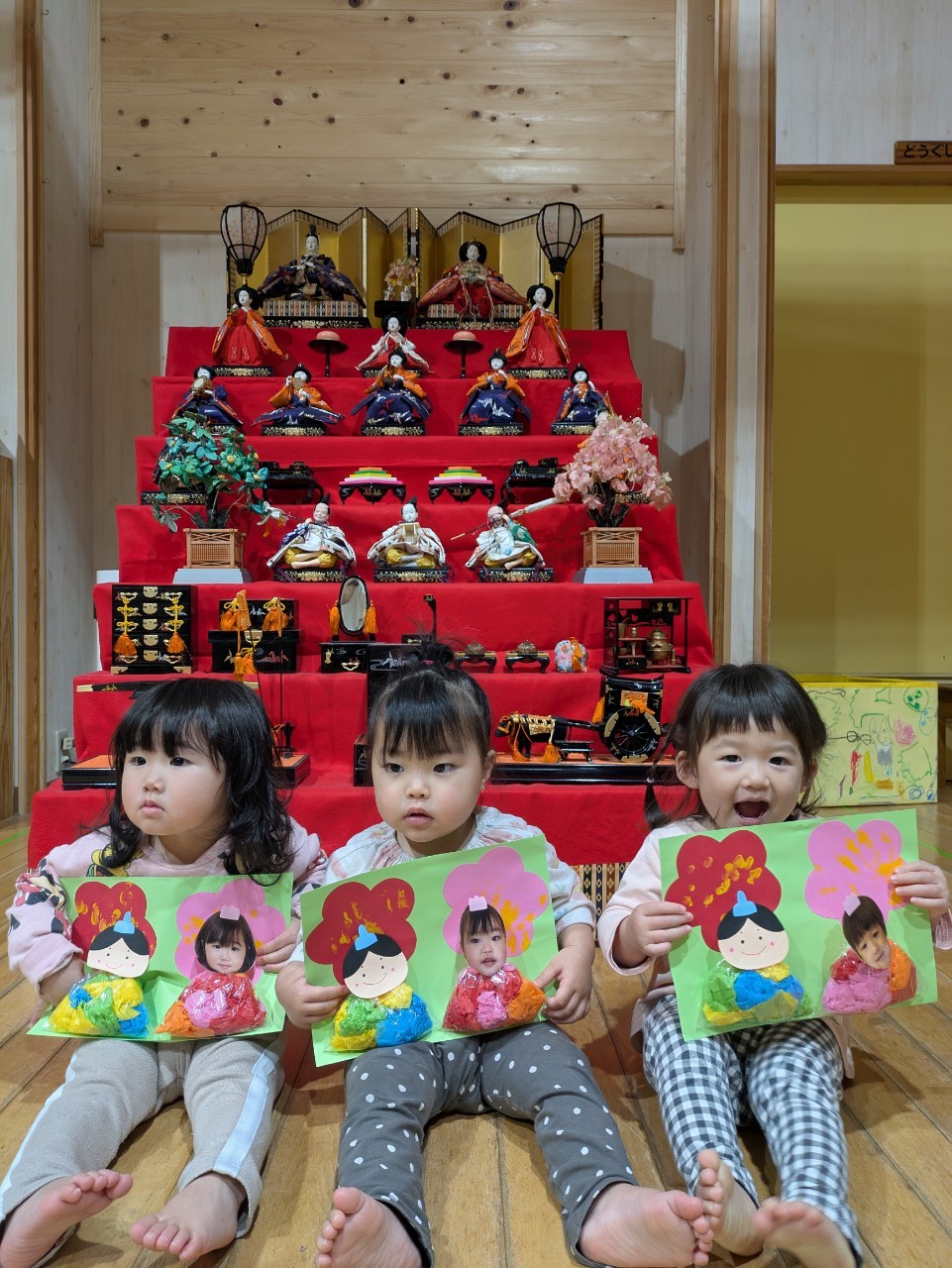 今日は3月3日ひなまつりです(*^-^*)ホールのひな人形前にみんな集まって、ひなまつりの由来クイズをしたり、きゃべつ組さんに手伝ってもらいながら、パネルのひな人形を完成させたりと楽しい時間を過ごしました(^^♪ひな祭りの制作紹介では、各クラス代表のお友達が前に出て、かわいい制作の説明をしてくれましたよ☆きゃべつ組さんは本物のひな人形を見ながら全て自分たちで大作を完成させています!!コツコツと頑張っていました!さすがきゃべつ組さんです!!最後は、ひなあられと甘酒代わりのカルピスもいただきましたよ( *´艸`)
