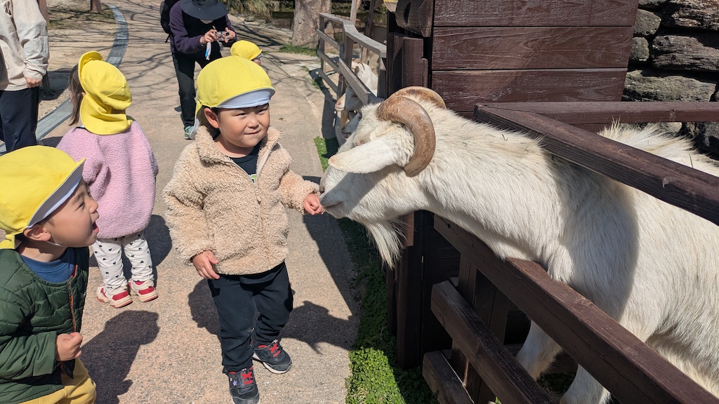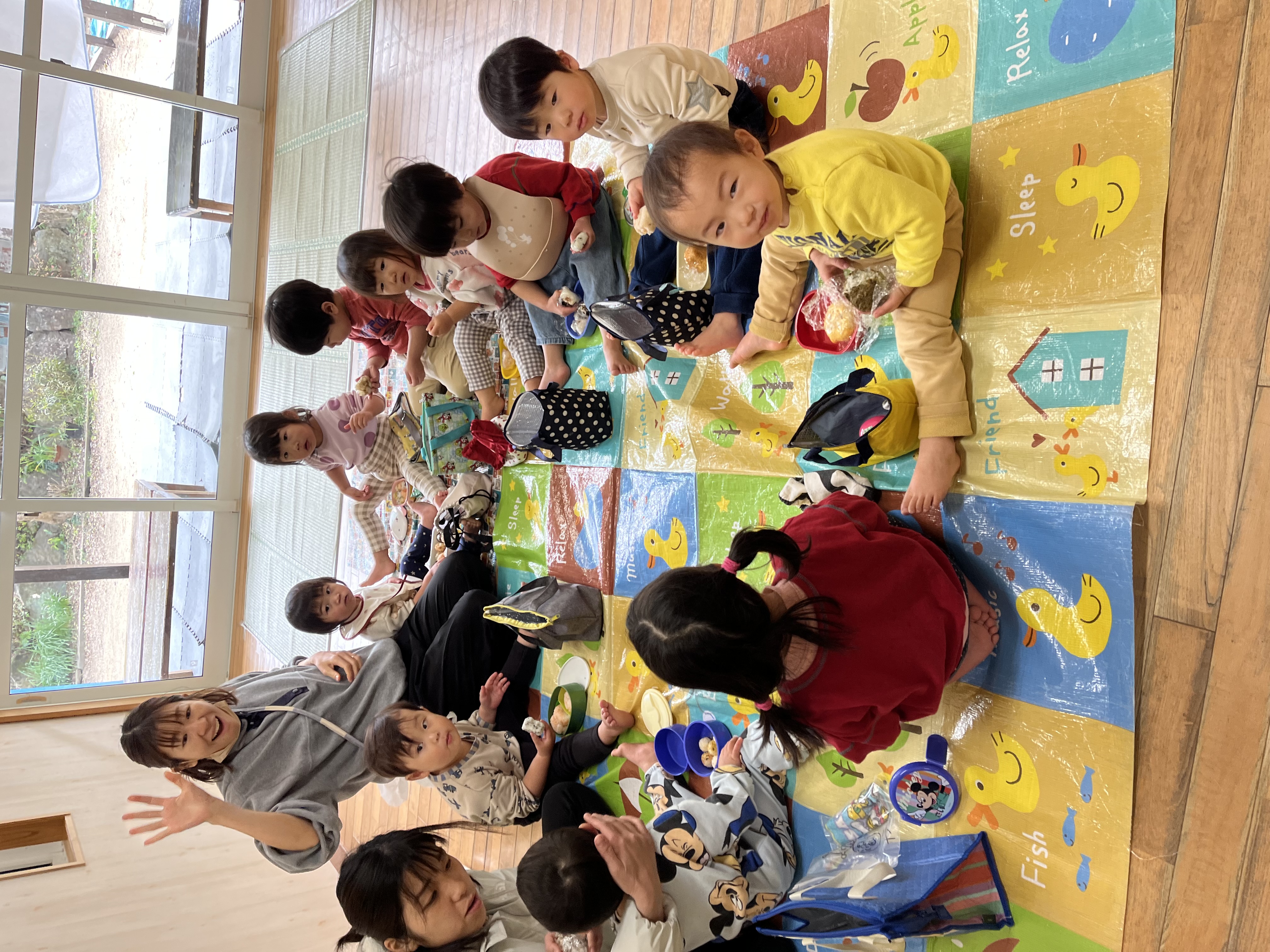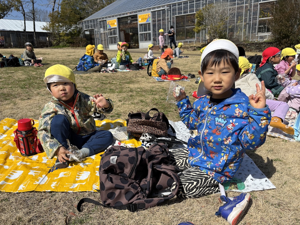 到着すると、かわいいお髭の羊やモコモコのヤギに夢中になる子、遊具に走り出す子、それぞれがキラキラの笑顔で楽しんでいましたよ( *´艸`)今日は風も強く、気温も上がらなかったので、みんなのお楽しみのおにぎりは、保育園に戻ってから頂きました!お部屋にレジャーシートを敷くと、おにぎりの入ったバックを嬉しそうに開ける子ども達でした!!残念ながら、体調不良で園へお留守番のお友達もいました(´;ω;`)次はみんなで参加できますように!