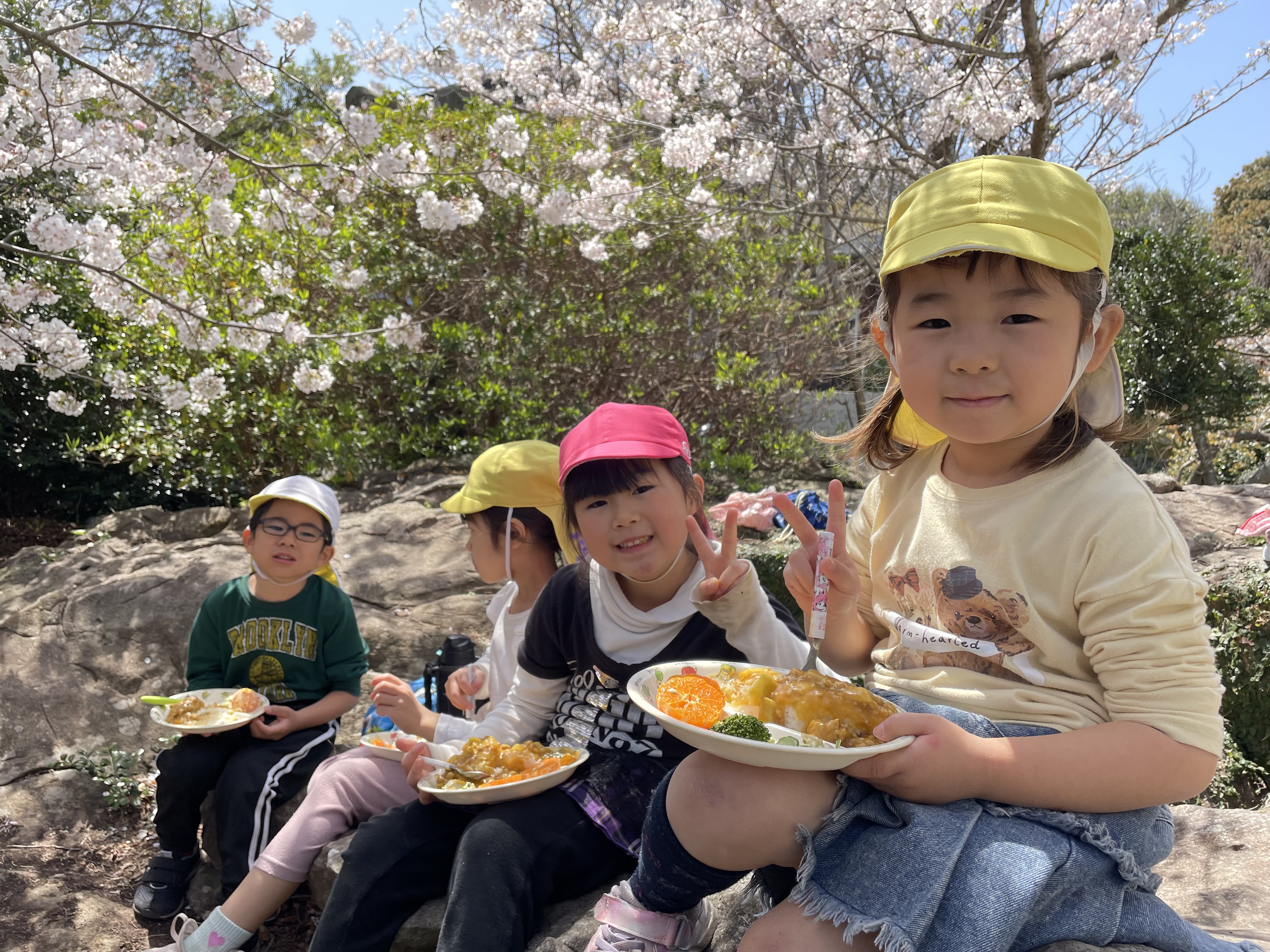 今年度が始まって4日が経ちました(*^-^*)新しいお部屋、新しいお友達、新しい先生に戸惑う子もいますが( *´艸`)この時期、「おっと!このお部屋じゃなかった~」と新しいお部屋へ向かう子ども達が可愛くてなりません☆新年度の何だかソワソワた気持ちが落ち着くのはもうすこし先のようですが…ひかり保育園では新年度のお楽しみ『お花見カレー』があるんです…(*^-^*)大好きなカレーを気持ちの良い空の下、桜の花を愛でながらモリモリ食べます!子ども達もとっても喜んでいます!今年もモリモリ完食です!!( *´艸`)