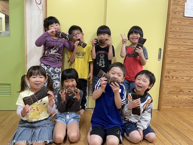今日はちまき作りをしました( *´艸`)長崎ちまきはもち米を唐灰汁(とうあく)に一晩漬け、筍の皮やさらしで包み、2~3時間ほど煮て作ります。子ども達はもち米がこぼれないように丁寧に包んだり、たこ糸で結んだりと苦戦しながらも頑張って作っていましたよ(*^-^*)長崎で昔から端午の節句に食べる習慣がある『長崎ちまき』それは中国から伝わる男の子の邪気を払う縁起のいい料理とされるもので、べっ甲色でもっちりとした触感と、独特な風味が特徴です(*^-^*)きな粉や砂糖、黒蜜などを掛けて美味しく頂きます!本日お土産で持ち帰りました!
