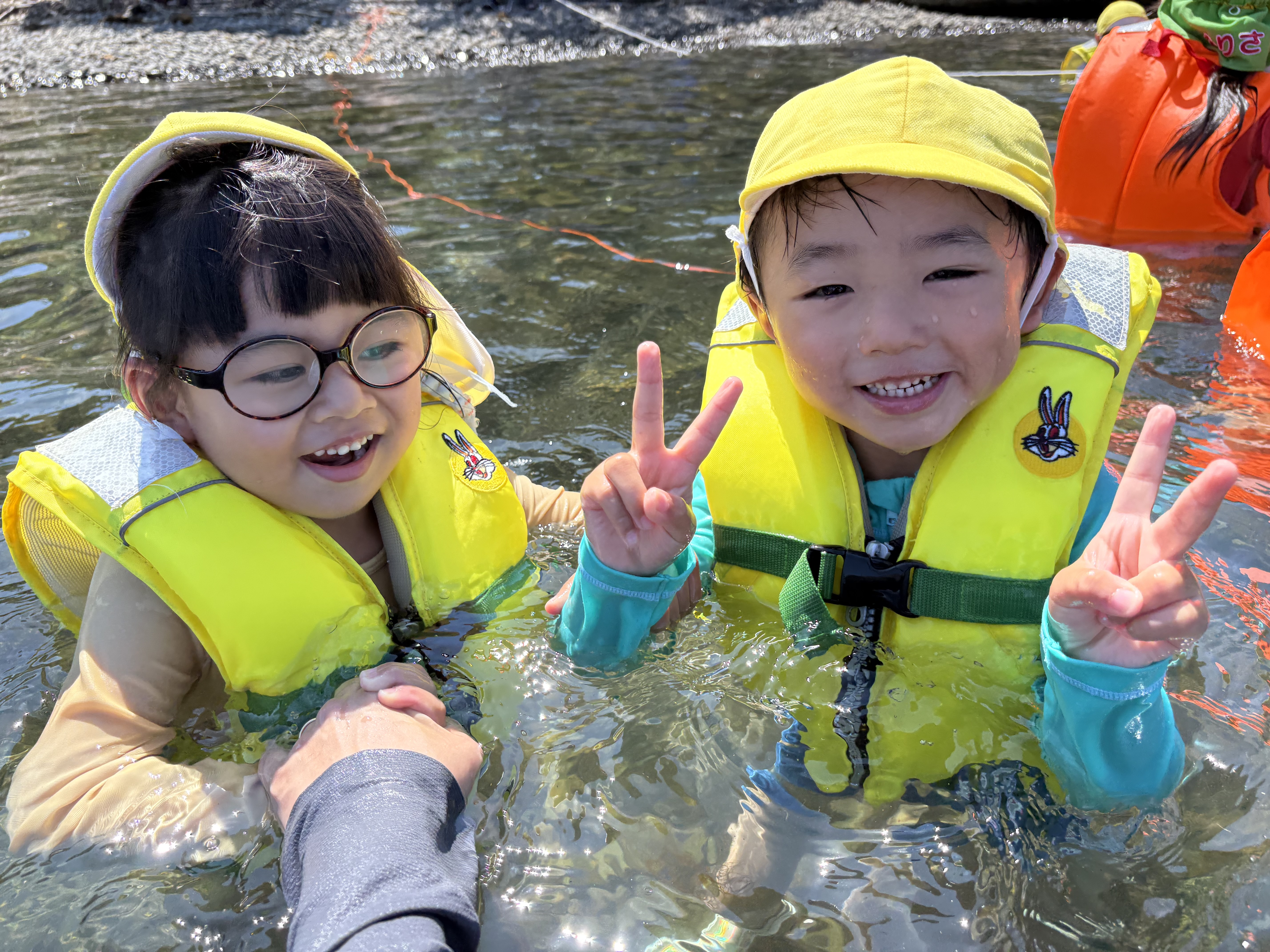 楽しみな中に少し不安を感じる子もいたようですが、川遊びや、朝食の食材のお買い物♪
