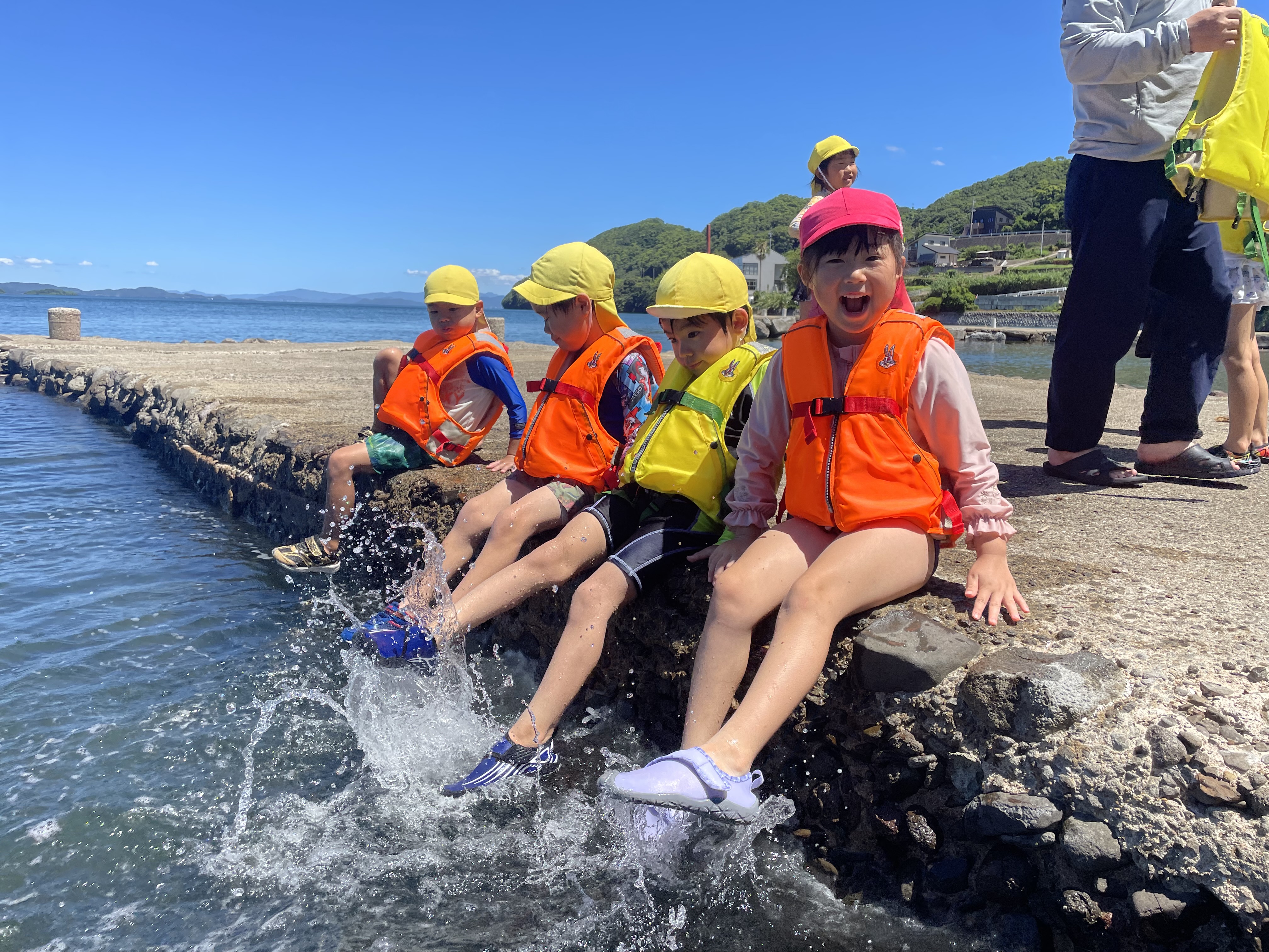 今日はきゅうり組さんの磯遊びの日です。朝のお集まりで「今から水着に着替えて海に行くよ!」と伝えると「やった~!!」とニコニコ笑顔で準備をしていました。園の近くの潮井崎公園は暑すぎることなく、心地の良い気温でした(#^.^#)浅瀬でバシャバシャ楽しんだり、堤防を歩いてみたり、海を満喫することができたきゅうりさんでした!!保育園に戻ってからのおにぎりタイムでは、みんな大きな口をあけておにぎりをほおばっていました!おにぎりのご準備ありがとうございました(*^-^*)