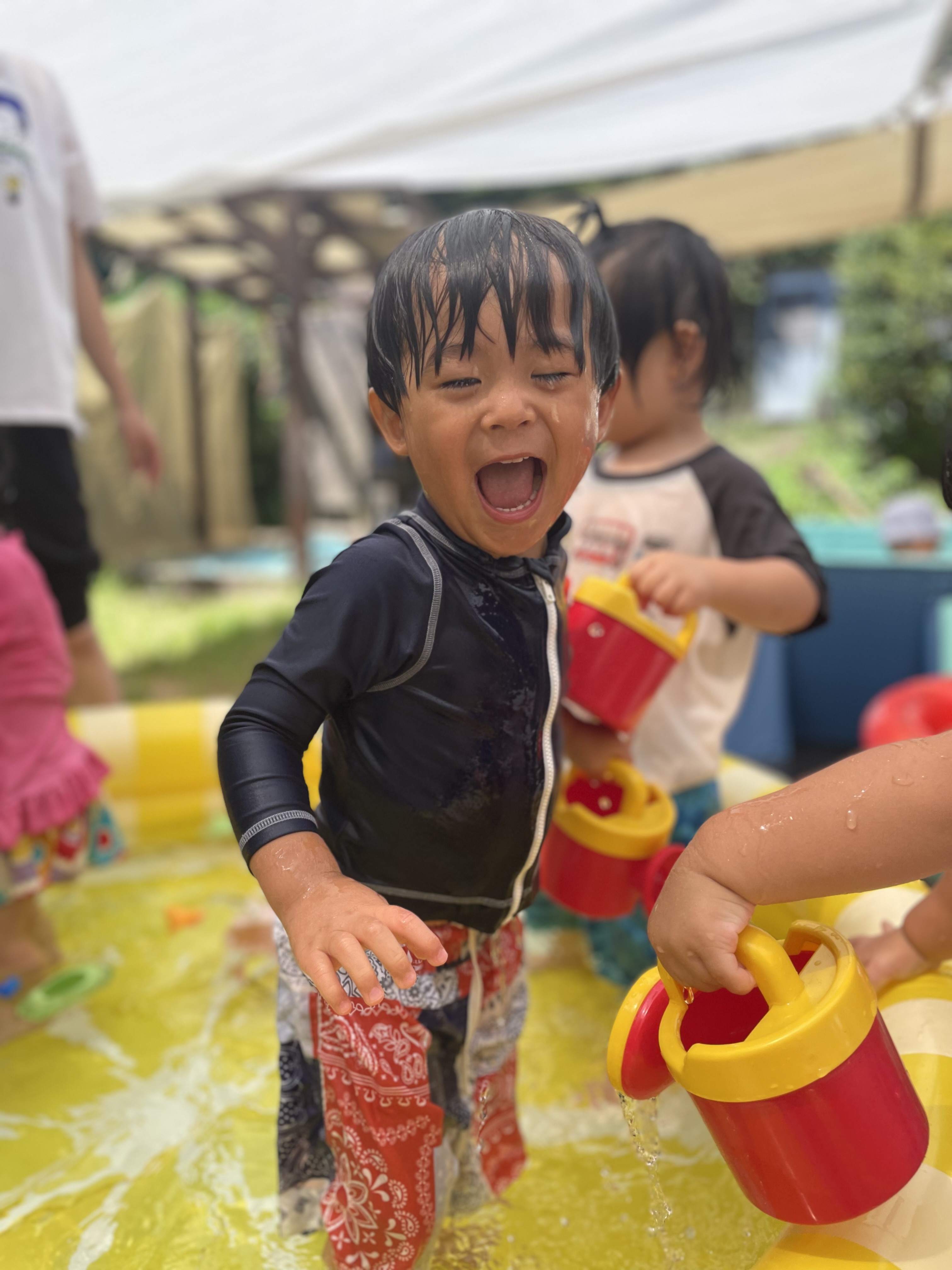 今日はとまと組さんの海水浴?の日です!堂崎の海から海水を汲んできて、テラスで海水浴気分を味わいました( *´艸`)海水の温度はちょっぴり温めで、みんな気持ちよさそうに入っていましたよ( *´艸`)プールに入ると手で海水をバシャバシャ!!しぶきが顔にかかるとビックリした表情を見せたり、ニヤッと笑ったり、ペロッと舐めてみたり( *´艸`)みんな色々な表情を見せながら楽しんでいました!海水プールの後はおにぎりタイム!小さなお友達も離乳食をパクパク(*^-^*)おにぎり・離乳食のご準備ありがとうございました!