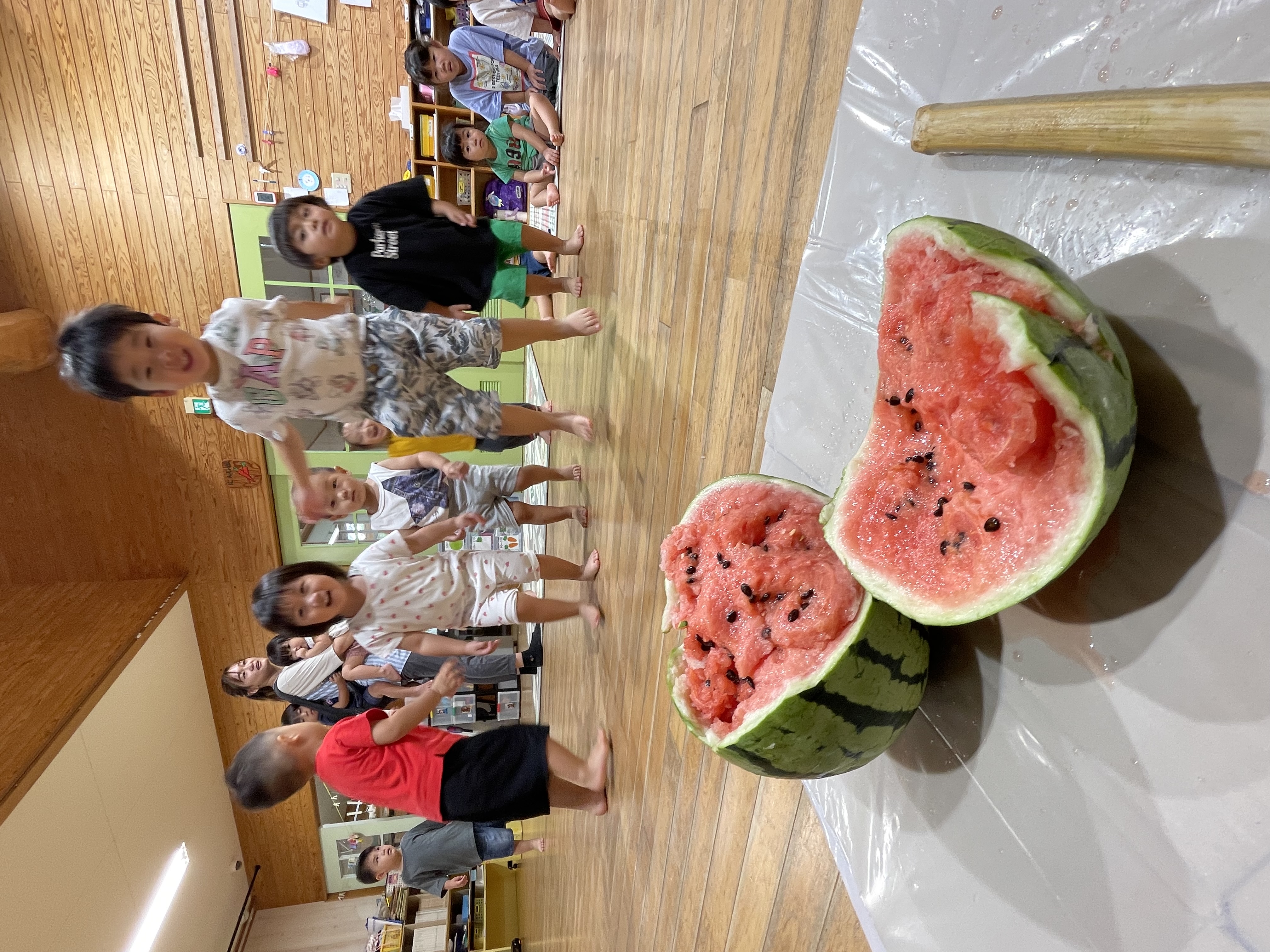 以上児さんは海水浴の日に海で行っていたスイカ割り(*^-^*)小さいクラスのお友達は室内で、3クラス合同で行いました( *´艸`)ホールにみんなで集まって、レッツスイカ割り!!とまと組のお友達も、保育士と一緒にチャレンジしましたよ!小さな手でスイカをつんつんしたり、押してみたり…抱えようとしたり( *´艸`)棒でポンポン叩いたりそれぞれの方法でスイカ割り体験です(^^)/スイカが割れると「やった~!!」と飛び跳ねて大喜びの子ども達でした!スイカを叩くときにもニコニコのお友達でしたが…割れたスイカを食べる時にはもっとニコニコ(*^-^*)幸せそうな表情を見せてくれました♡