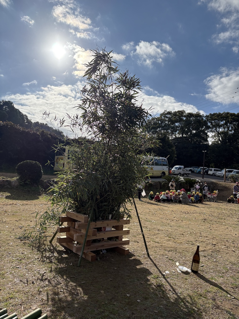 竹で組んだやぐらの中にお正月に飾ったしめ縄やお札を入れて燃やし、今年一年の無病息災や家内安全を祈願する行事です(*^-^*)雪が降り少し伸びましたが…冬の晴天の中い粉うことができました(*^-^*)炎で温められた竹の中の空気が膨張し「パーン!!」と大きな音をたててはじける時には「鬼(おん)の骨~!!」と邪気を払う掛け声をみんなで元気いっぱい叫びました( *´艸`)子ども達のお願いごとを描いた紙も鬼火と一緒に空高く飛んでいきました(*^^*)みんなの願い、叶いますように!!