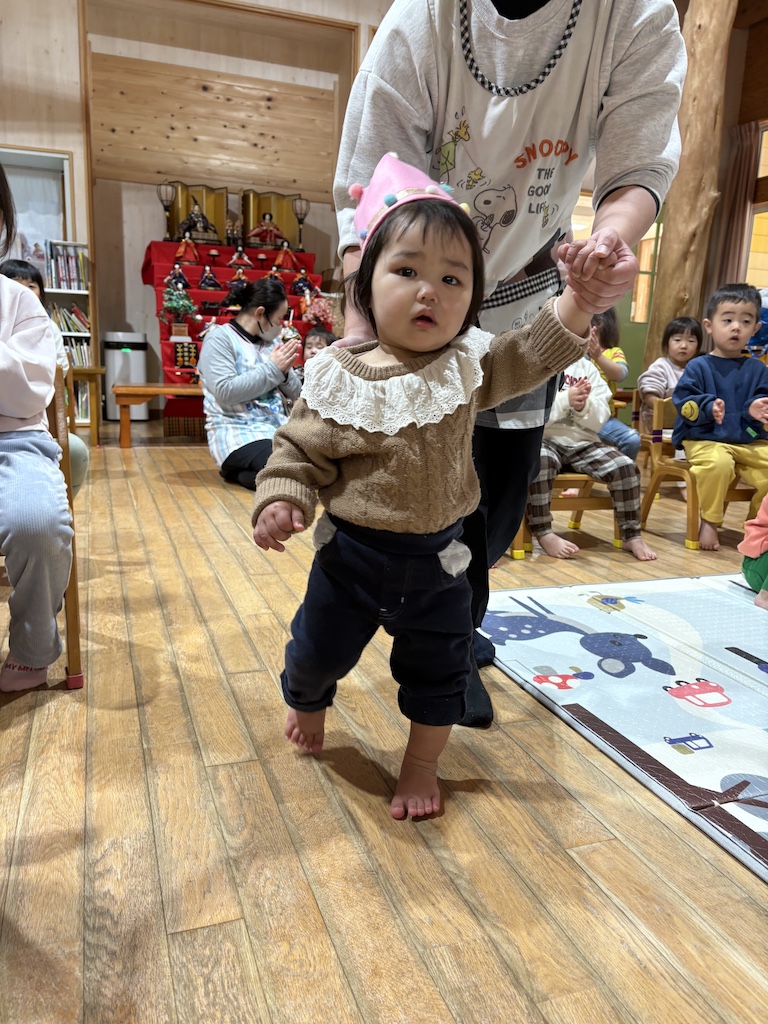今年度最後の誕生会です!3月は3名のお友達がお誕生日を迎えました(*^-^*)入場曲が流れると3人で仲良く手を繋いで入場する姿がなんとも愛らしく、みんな笑顔になりました( *´艸`)恥ずかしがりながらもしっかりと自己紹介頑張りましたよ!!先生達からのプレゼントは『春ですよ』と『はじめのいっぽ』のペープサート。かわいい虫達や動物が登場すると、小さなお友達も指さしたり笑顔になったり楽しんでみてくれていました(^^♪