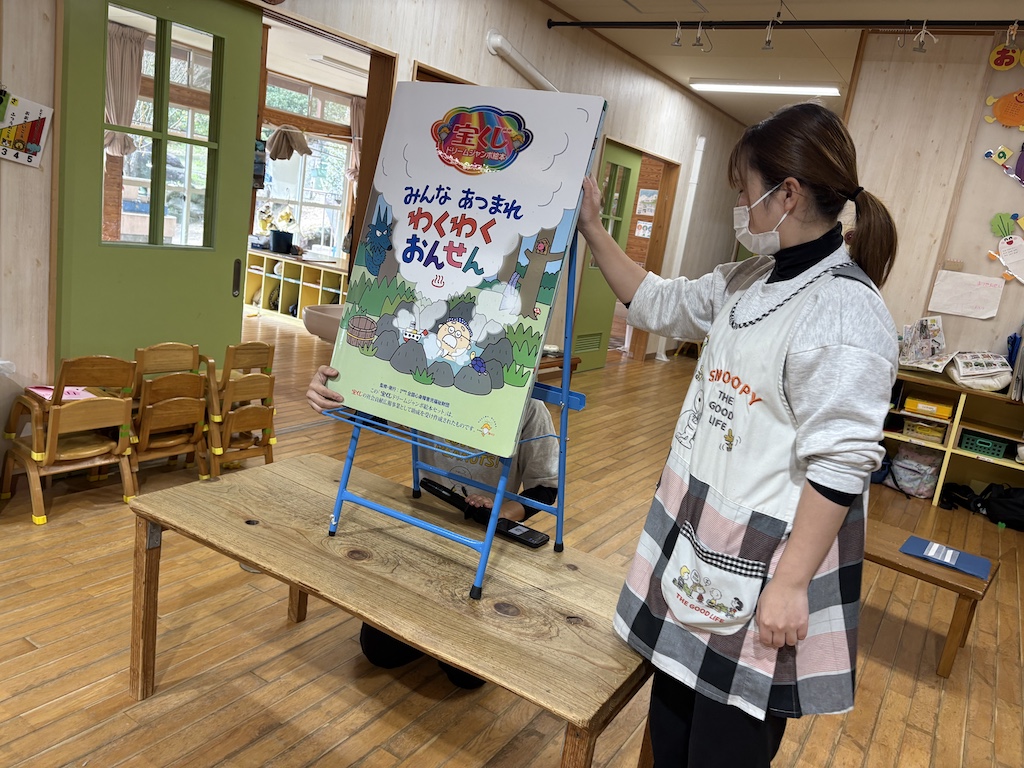 今月は1名のお友達がお誕生日を迎えました(*^-^*)1月のお誕生日会の日お休みだったお友達と2月生まれの先生も一緒にお祝いしましたよ(^^♪みんなから気持ちのこもったお歌のプレゼントの後は…まだ肌寒いこの季節にピッタリの大型絵本『わくわくおんせん』!