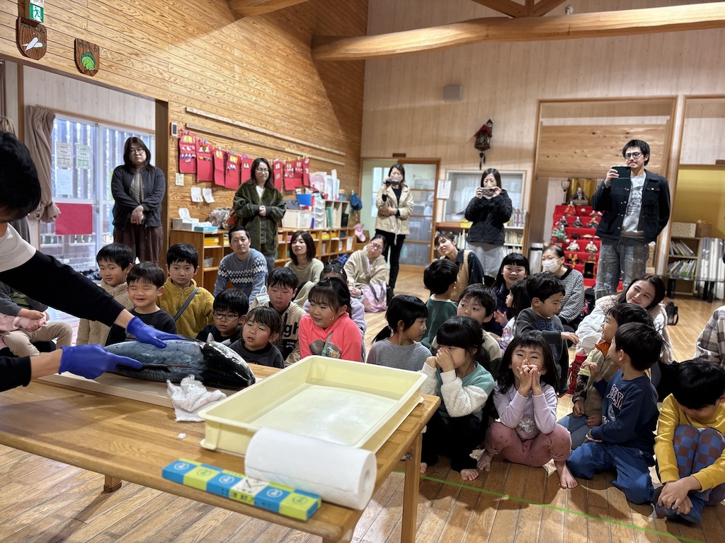 ひかり保育園では年間を通して魚を身近に感じ、長崎という魚の美味しい地で『魚食』をテーマに活動を企画し、子ども達と一緒に楽しみながら学を深めています♪今回は魚食活動の4回目(今年度最終回)で以上児の保護者の方々も一緒に参加していただくイベントを行いました( *´艸`)子ども達が登園するより早く保育園にやってきたのは…大きなヒラマサ(体重5キロ)イベントの中で解体ショーを行い、魚のアラ汁やハトシを提供しました(*^-^*)アラ汁は園庭の大鍋でグツグツ♪アラ汁もハトシも「美味しい!」「おかわりください~」と大好評でした!ご参加いただいた皆様!ありがとうございました(^^)
