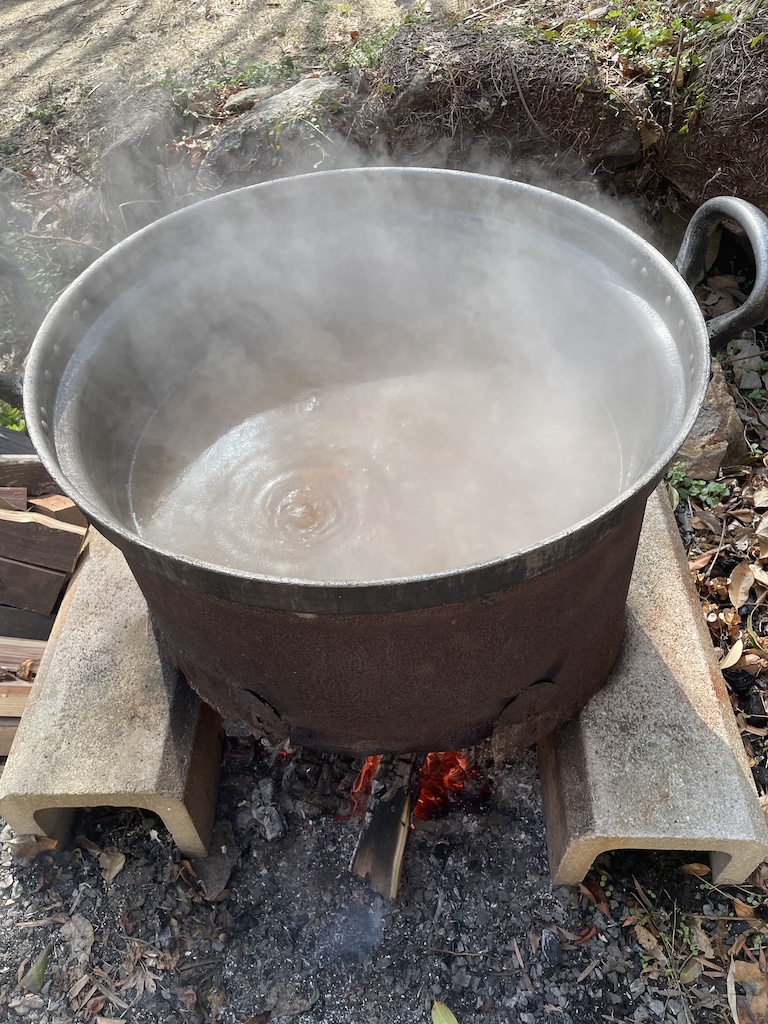 毎年恒例のお正月飾りを燃やして煙を浴び、1年間の無病息災を願い、鬼火焚きをしました。