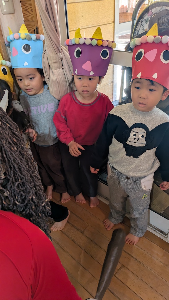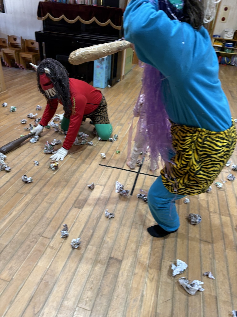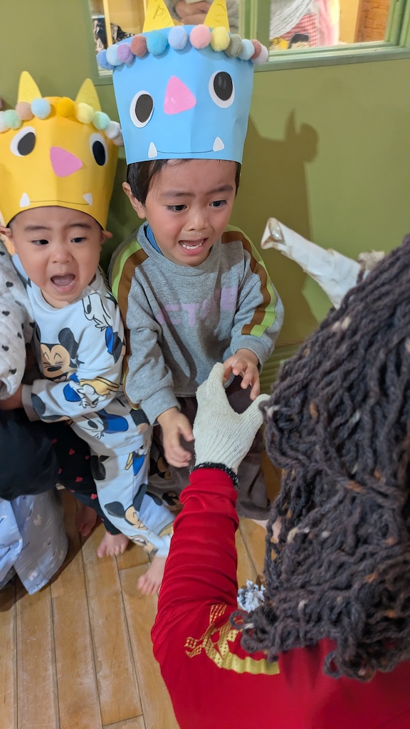 今年もやってきました今日は『節分』です。ホールにて節分のお集まりをして、由来クイズや子ども達の力作ぞろいの鬼のお面を紹介しました(*^-^*)個性豊かな鬼のお面を被った子ども達はどこか緊張した表情です…園長先生の口上を聞いて、鬼が登場すると豆まきがスタート!!(大豆の誤飲防止の為、新聞紙を丸めたものを豆に見立てて撒いています。)赤鬼と青鬼の登場にびっくりしながらも「鬼は外!」「福は内!」と元気に!そして必死な子ども達( *´艸`)