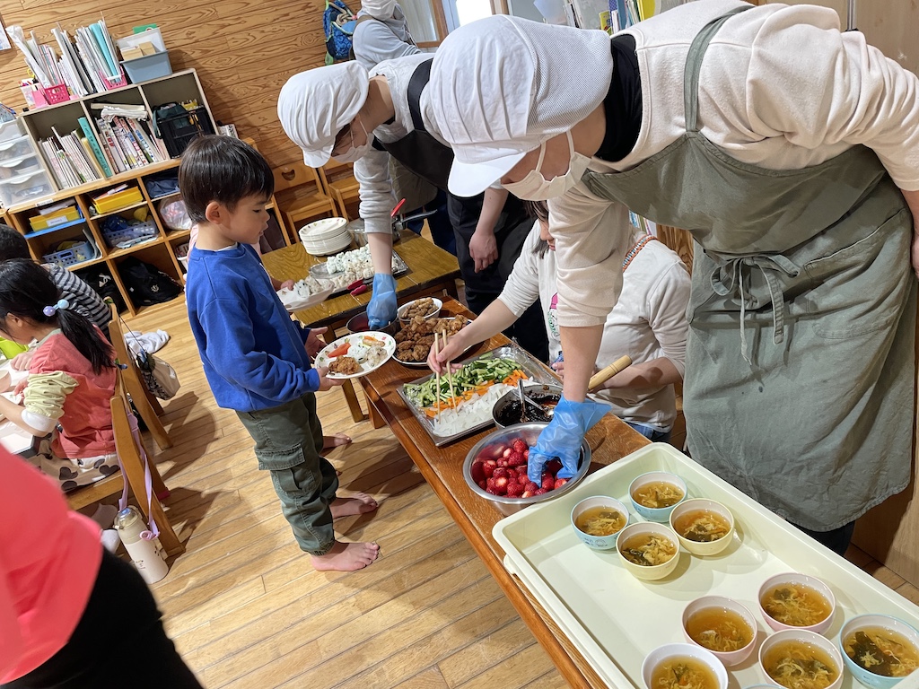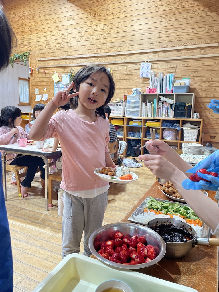 そして、みんなのもう一つのお楽しみは…きゃべつ組さんのリクエストメニュー!バイキング給食♪おにぎり、から揚げ、たまごスープ、イチゴ、野菜スティックなどなど!みんなおかわりして食べていました(#^.^#)
