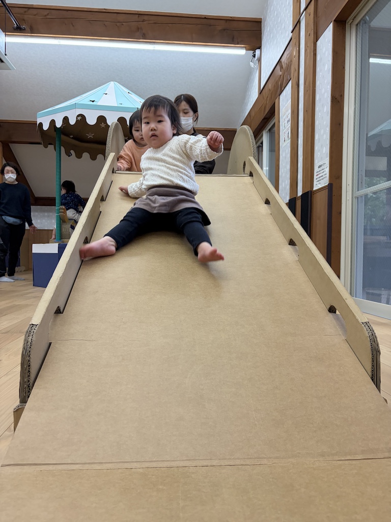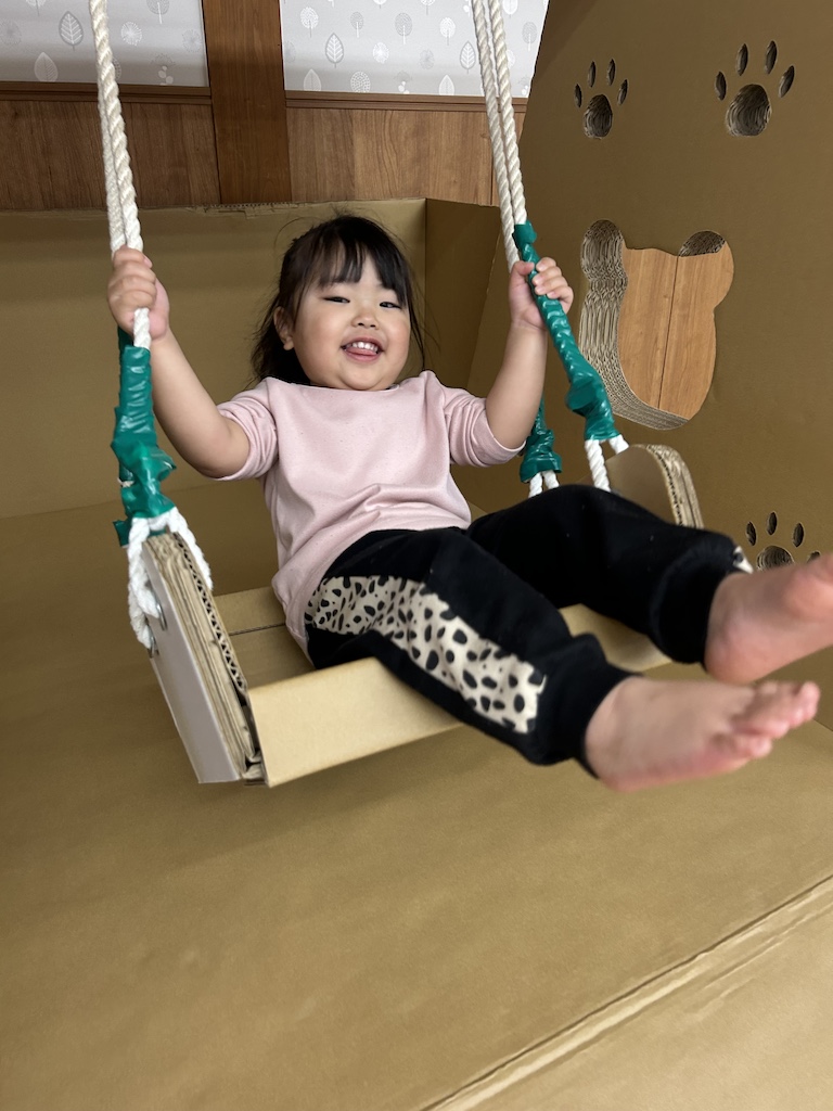 今日はきゅうり・なす組さんで崎野自然公園内にある『さきのランド』に行ってきました。段ボールでできた遊具がたくさん設置してあり、みんな大はしゃぎで遊んでいましたよ(#^.^#)木の遊具とはまた違う温かさがある段ボール遊具、メリーゴーランド、ブランコ、滑り台、おままごと、段ボール積み木などなど…とっても楽しい空間でした!たくさん身体を動かした後は~みんなお待ちかねのおにぎりタイム!!愛情たっぷりのおにぎり、みんなにっこにこで完食です( *´艸`)いつもおにぎり準備ありがとうございます!!