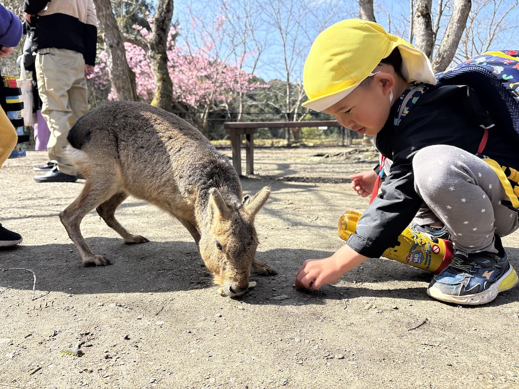 にんじん・だいこん・きゃべつ組さん(以上児)でバスに乗り込み、目的地は…バイオパークです(*^-^*)行のバスではワクワクが溢れて賑やかです(*^-^*)暖かな天気にも恵まれ、最初のマーラエリアでは「かわいい!」「かわいい!」と大喜びのみんな☆太陽の降り注ぐ気持ちのいい広場ではおにぎりタイム( *´艸`)愛情たっぷりのおにぎりでパワーを充電し、アップダウンのある道も可愛い動物たちに歓声を上げながら、みんなで最後まで元気に歩くことができました(^^♪